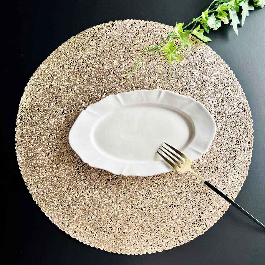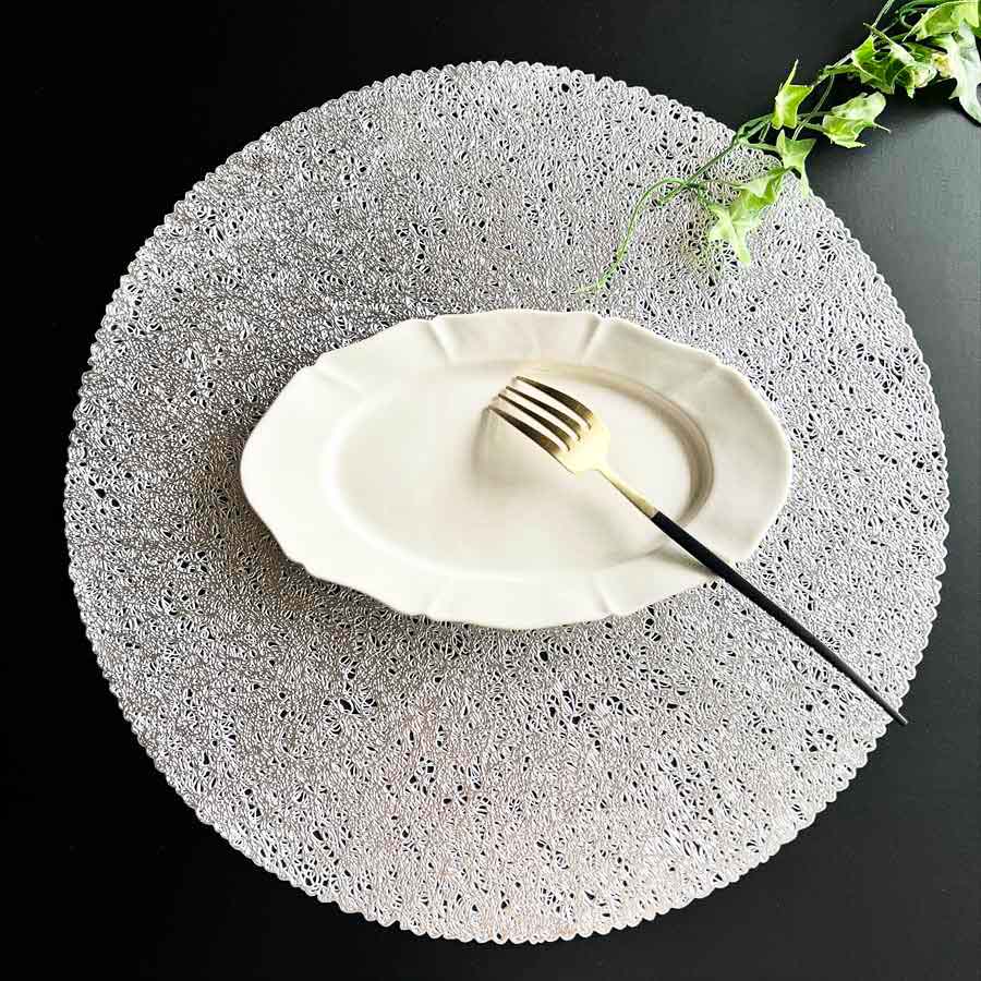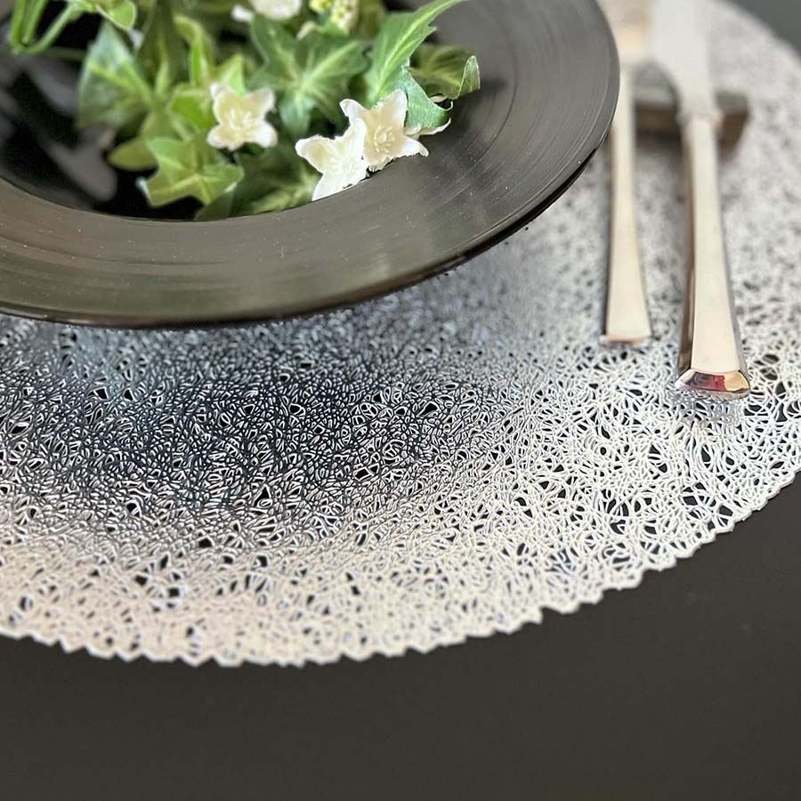 繊細な糸を紡いだようなデザインが美しい、ラウンドタイプのPVCランチョンマット。