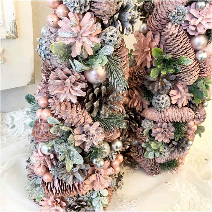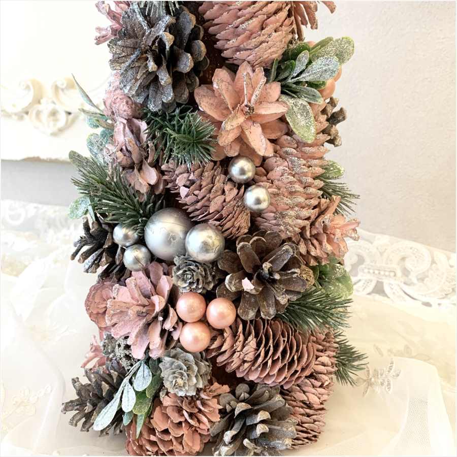 ピンクの松ぼっくりやお花、シルバーのオーナメントを贅沢にあしらい、ロマンチックで華やかなデザインに仕上げました。