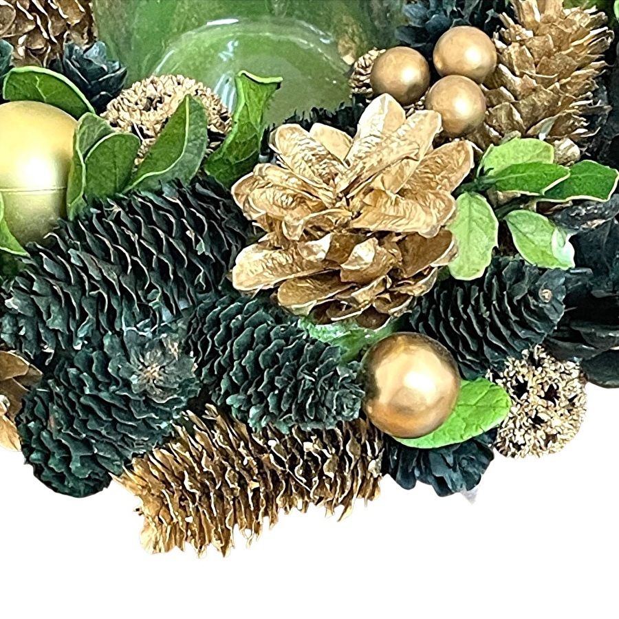 自然素材の松ぼっくりや木の実、グリーンをふんだんに使い、華やかなゴールドのオーナメントで仕上げました。