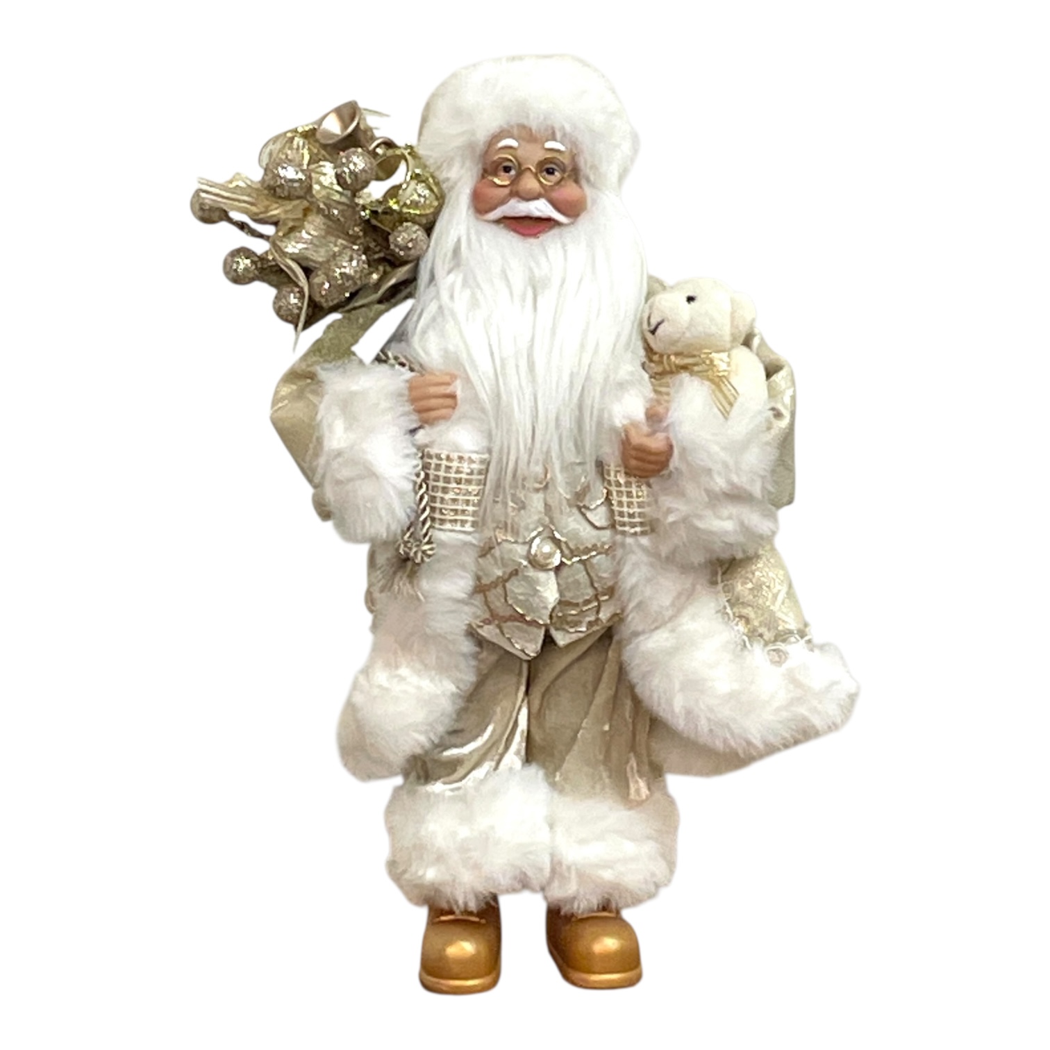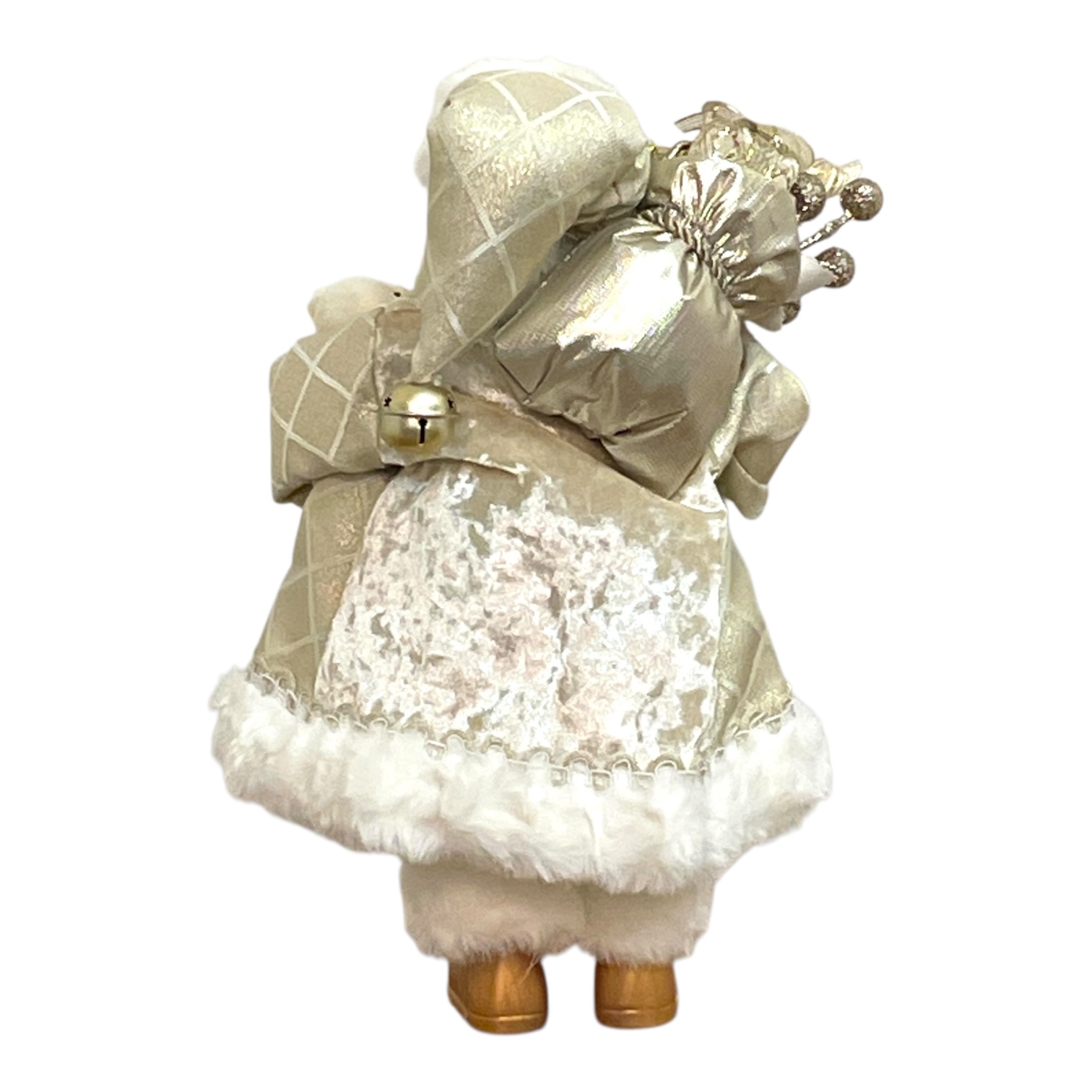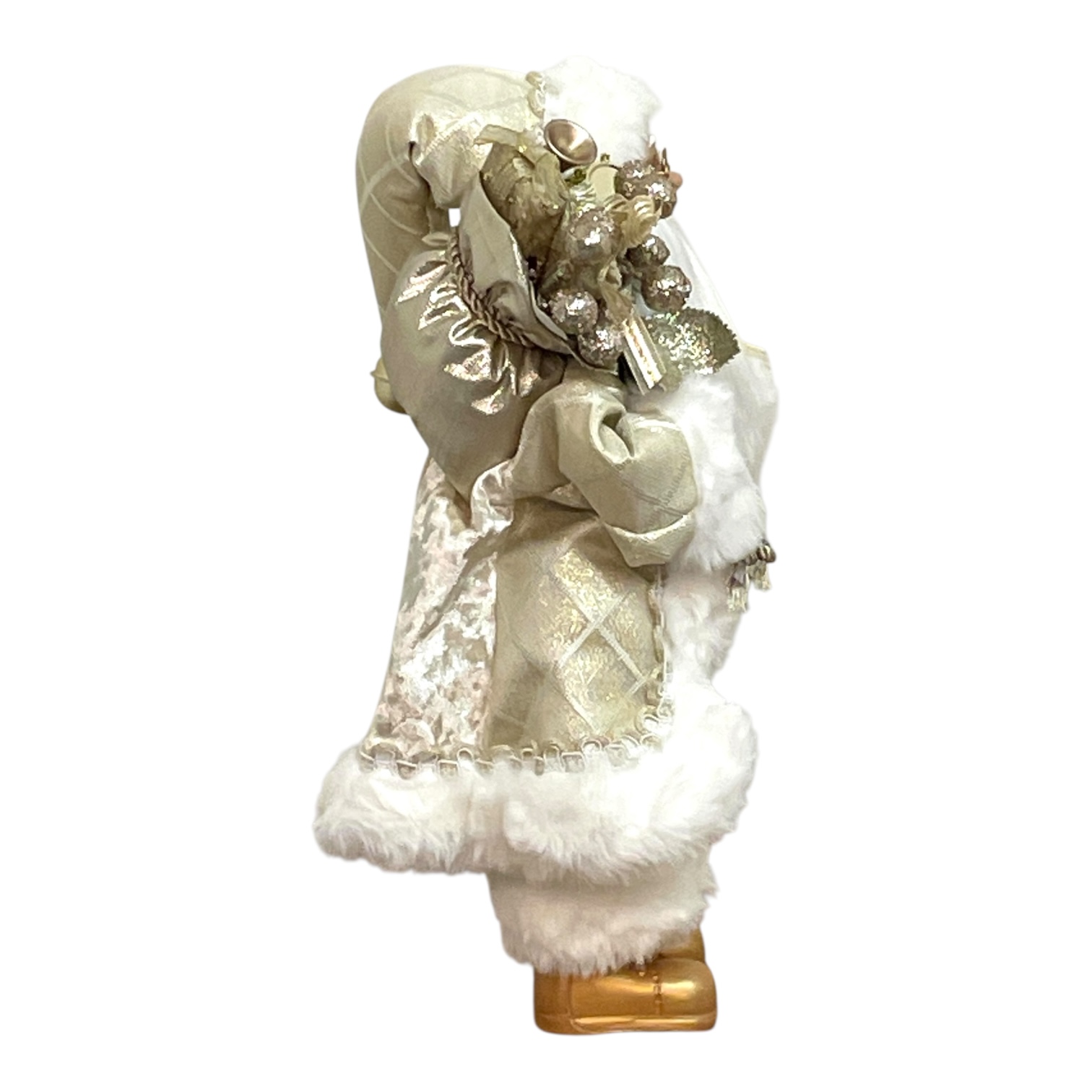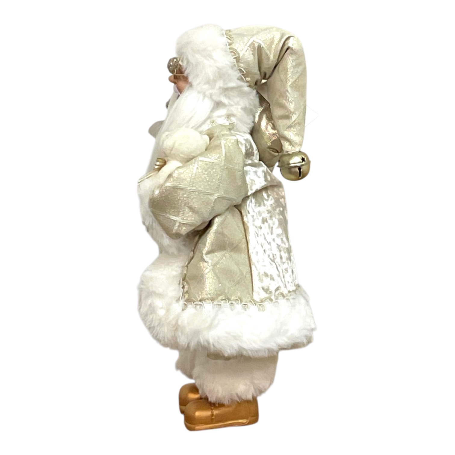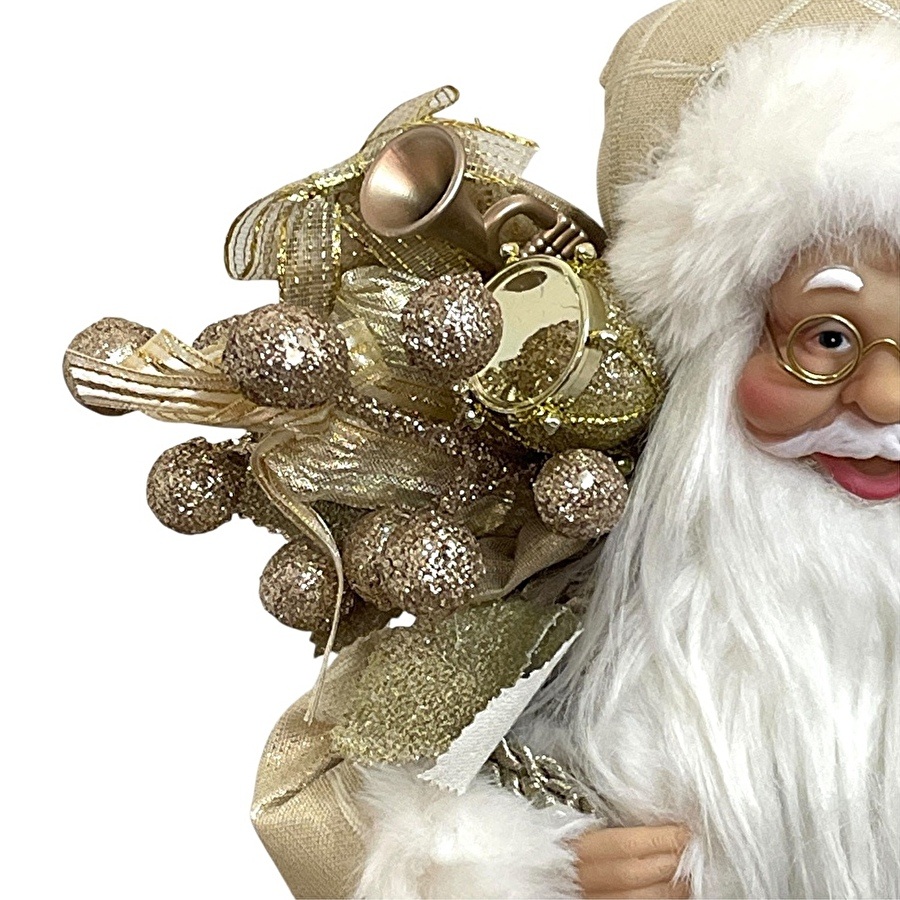 やさしい光沢が美しい、シャンパンゴールドの装いが印象的なサンタクロース人形。