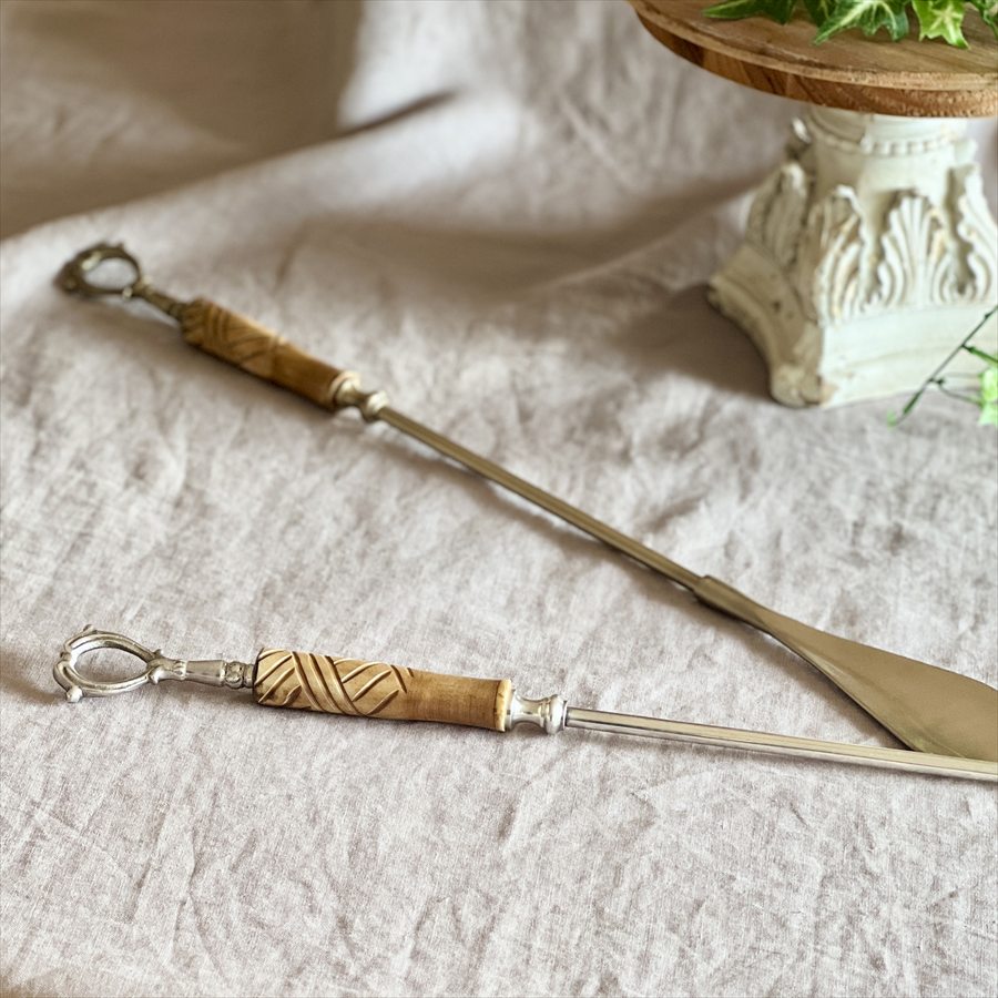 クラシカルな雰囲気を纏う、真鍮と天然木ハンドルを組み合わせたロング靴べらです。