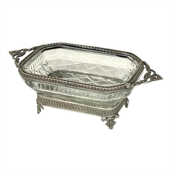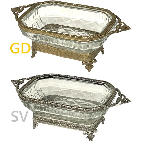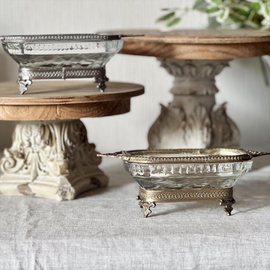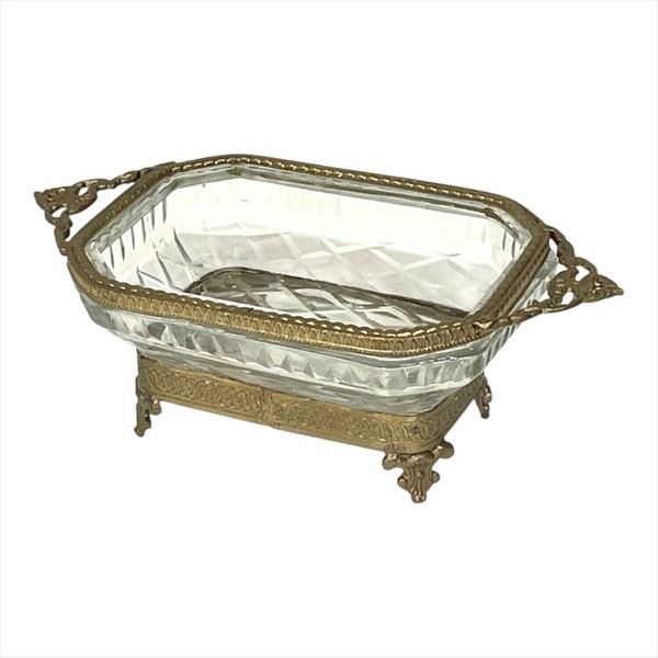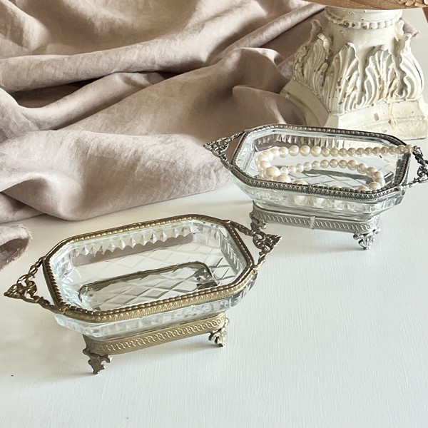 繊細な装飾が施された真鍮フレームと、透明感あふれるカットガラスを組み合わせたアンティーク調トレイです。