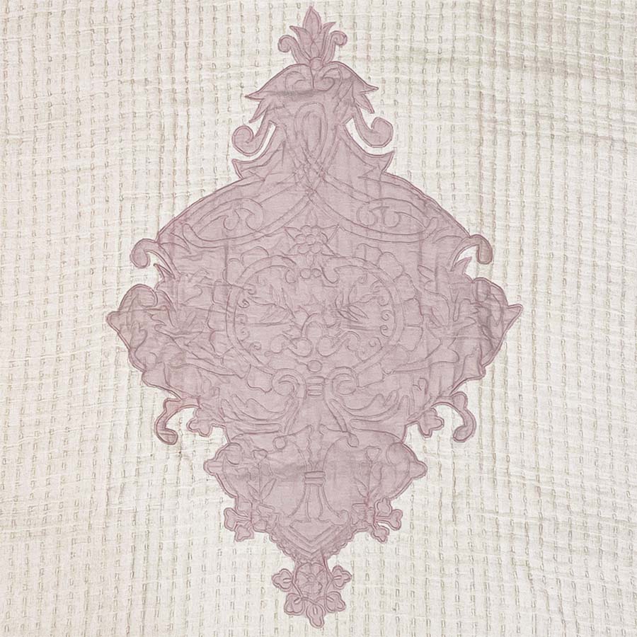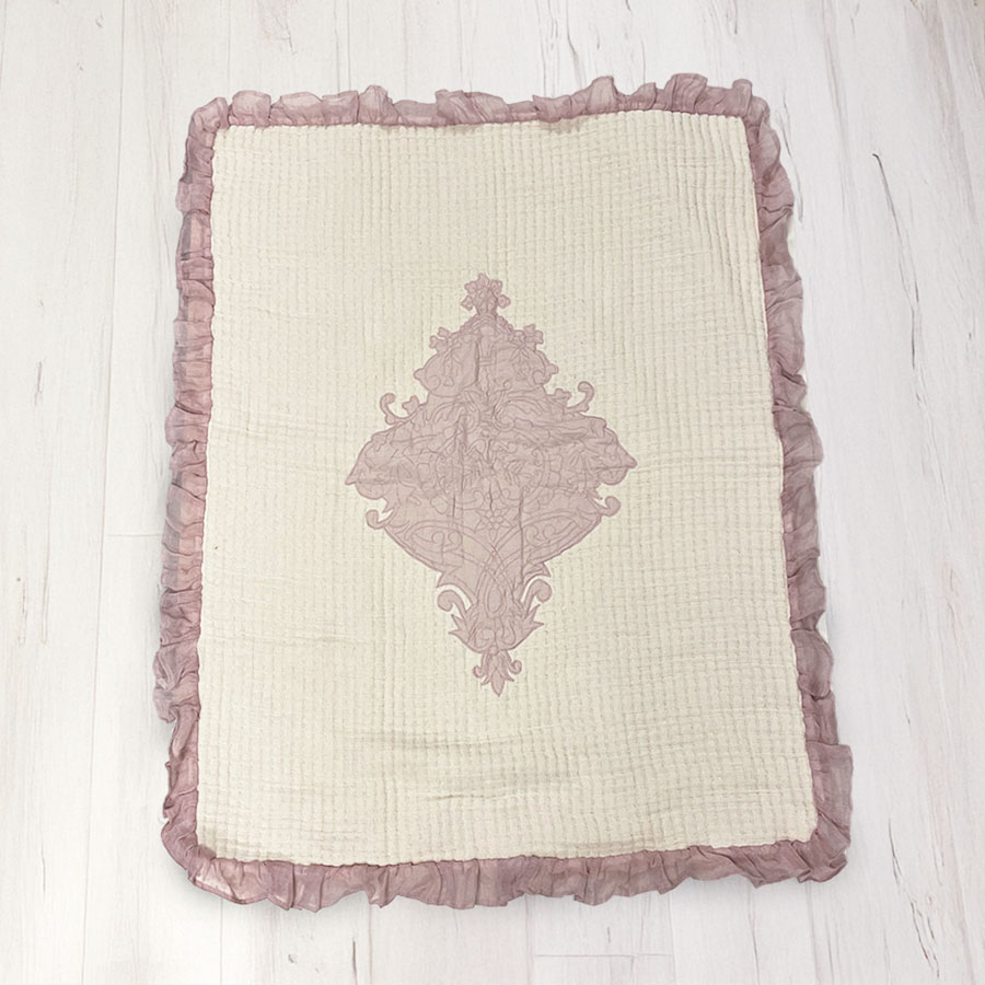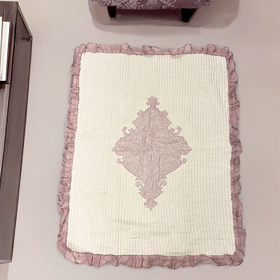 やさしい生成りカラーに、アンティーク調のモチーフをあしらった上品でナチュラルなフリル付きマット。