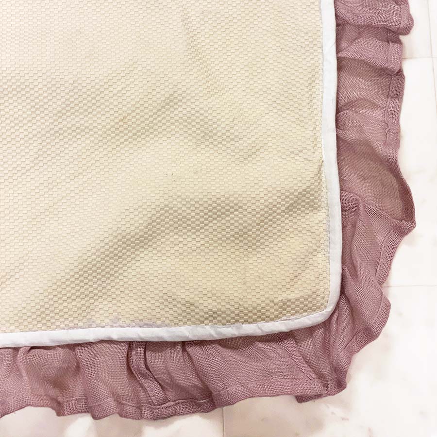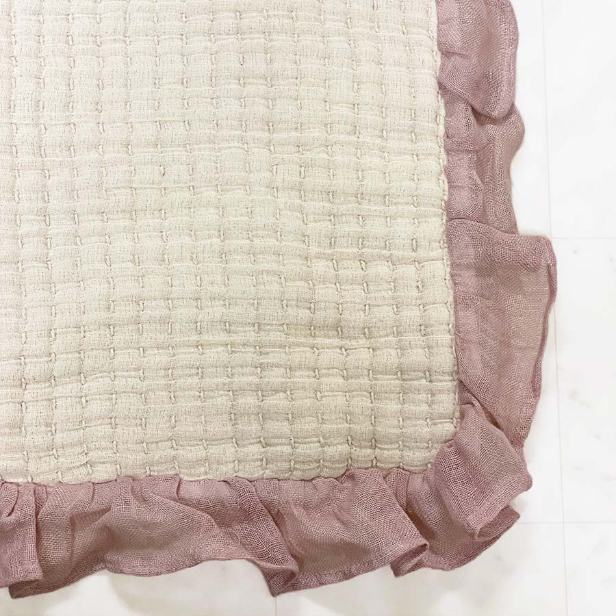 本体には肌触りの良いコットン素材を使用し、縁取りのフリルにはリネンを合わせることで、シンプルながらも表情のあるデザインに仕上げています。