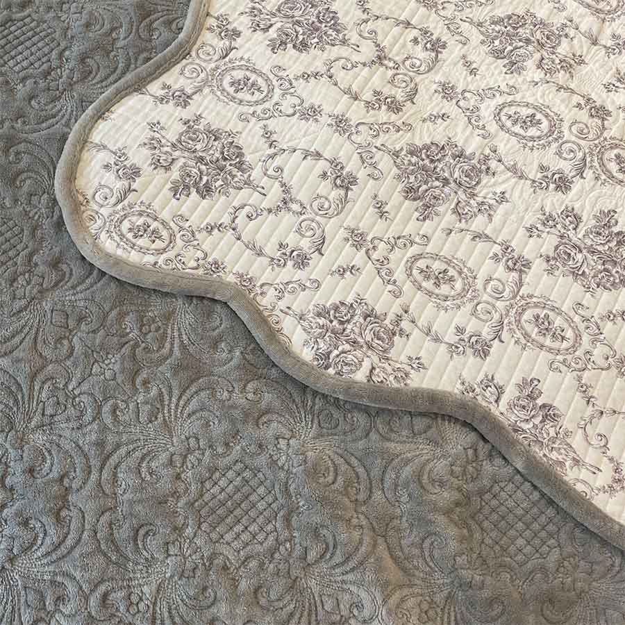 表は、美しい光沢のシルバーグレーで、リバーシブルの裏地はホワイトキルに落ち着いたグレーパープルのデザインプリント。