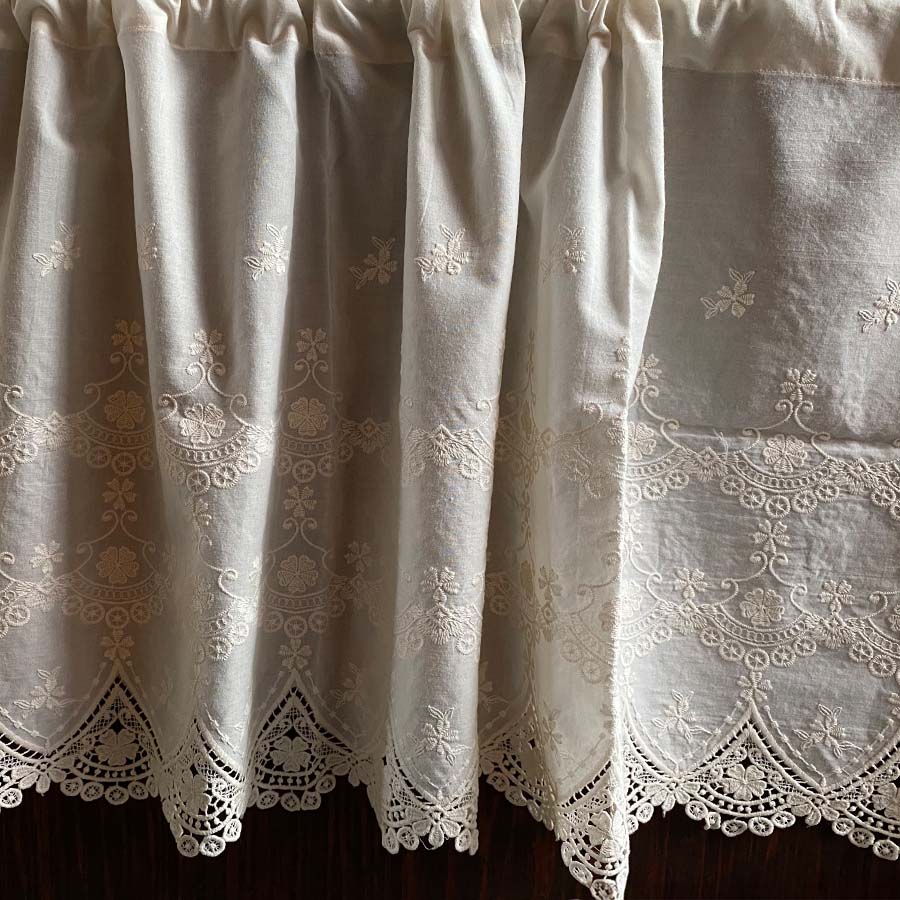 蝶やお花の刺繍が施されたホワイトの綿生地に小花が浮き上がるように刺繍された可愛いカフェカーテンです。