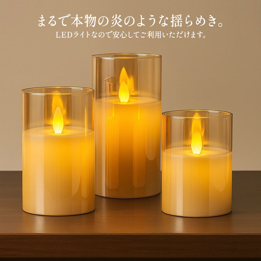 本物の炎のようにゆらめく光が魅力的なLEDキャンドル。ガラスとプラスチックの組み合わせで高級感がありながらも安全にお使いいただけます。