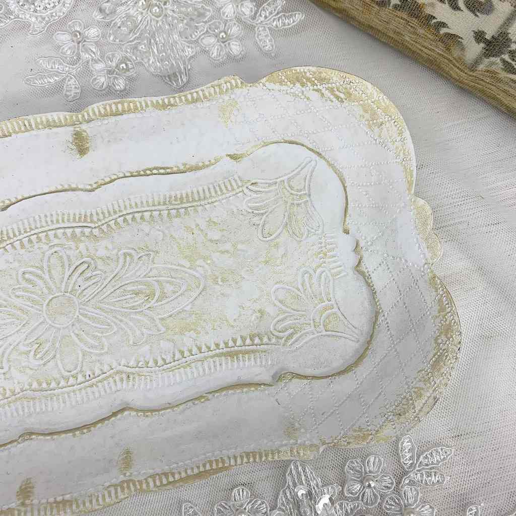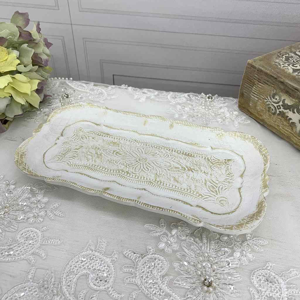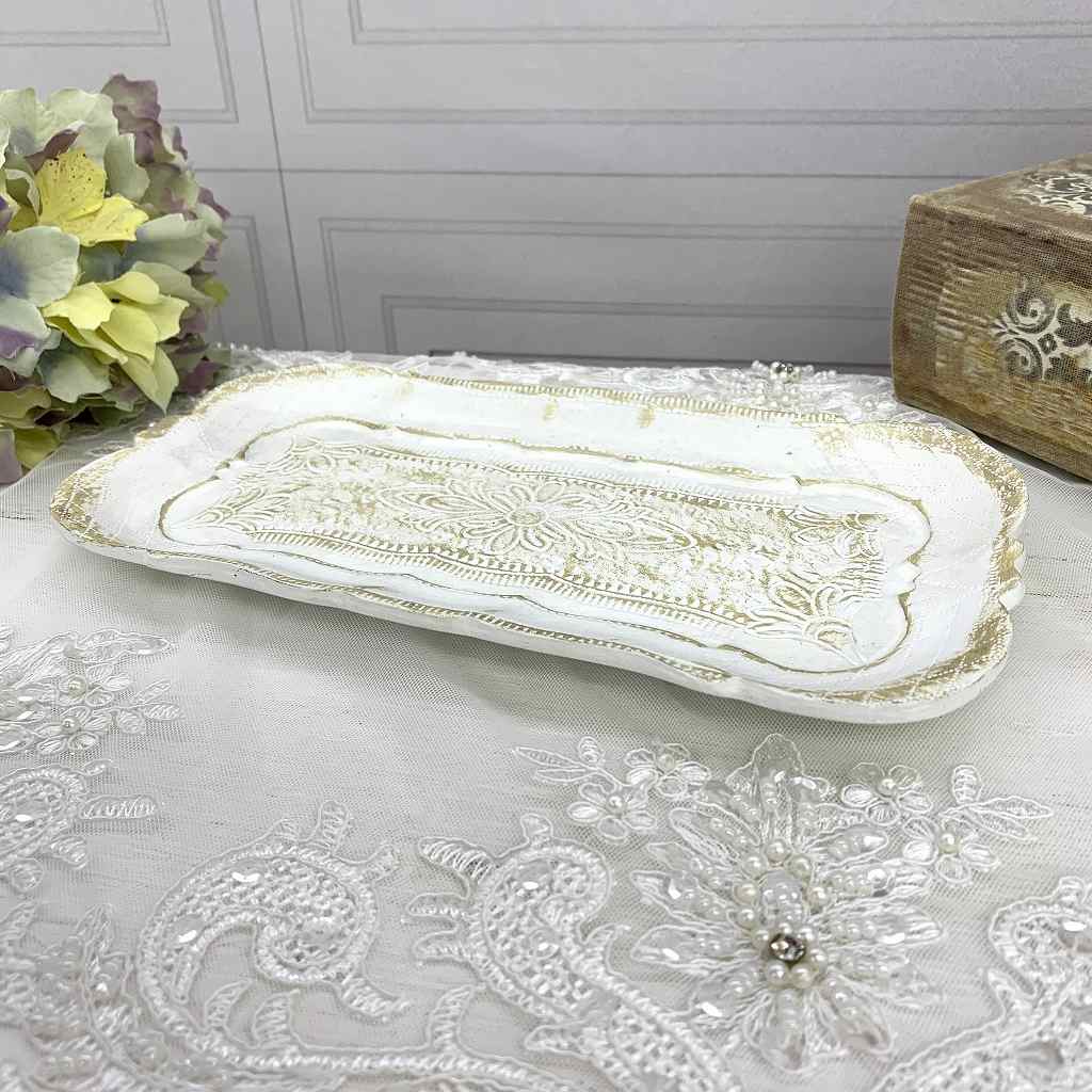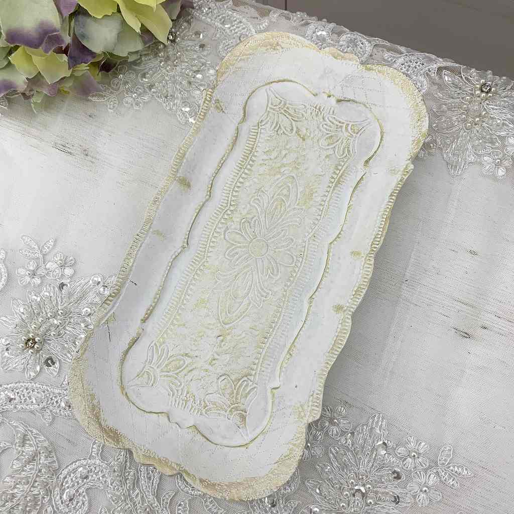彫刻されたようなクラシック模様からゴールドの下地がのぞくような非常に凝った塗装を施した美しいアンティークホワイトのトレイです。