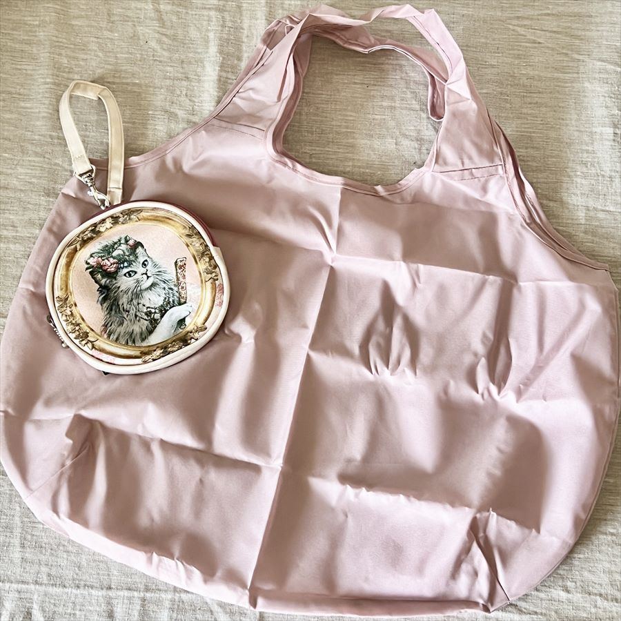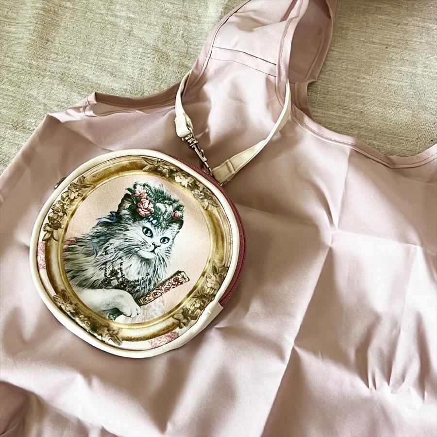 まるでシルクのような柔らかく高級感の有るポーチにお洒落な猫のプリント、中を開けるとエコバッグが収納されています。