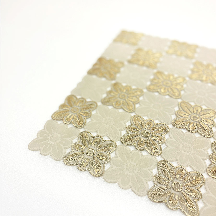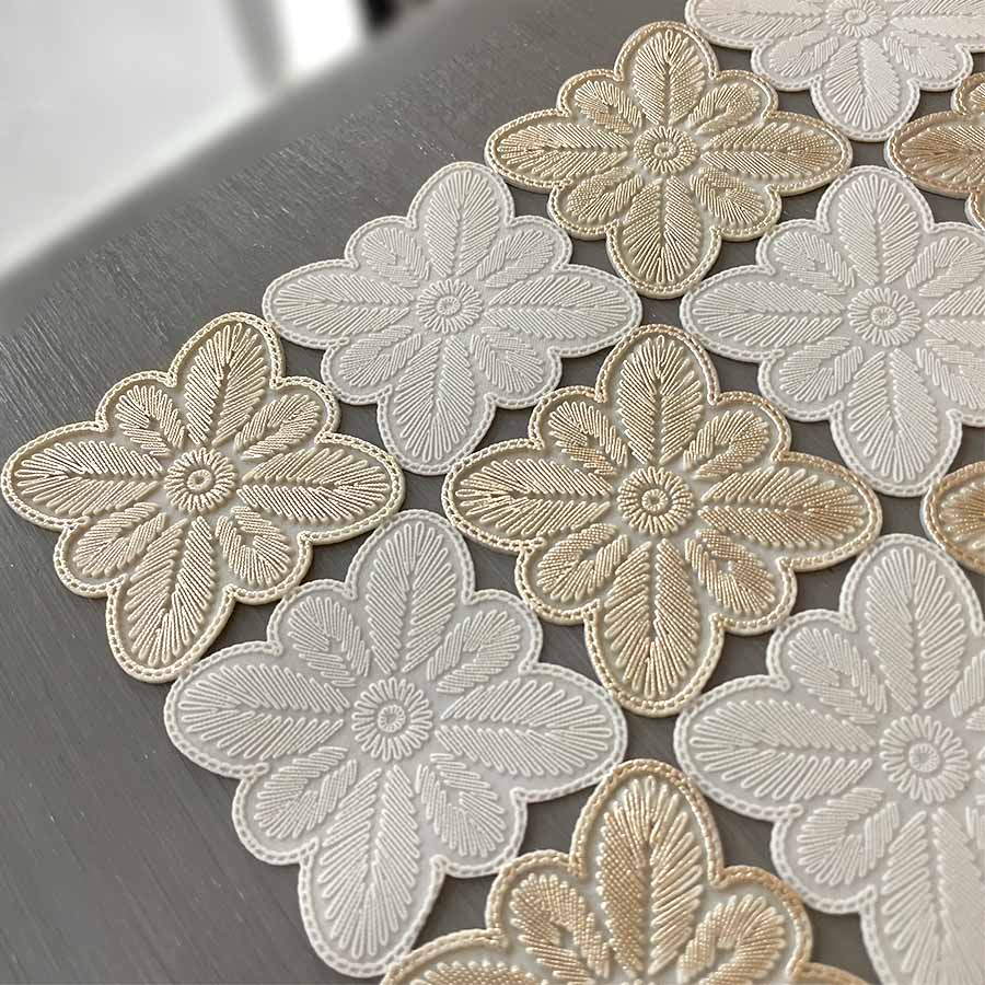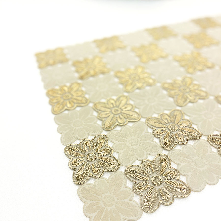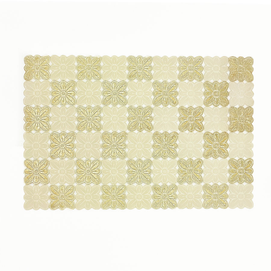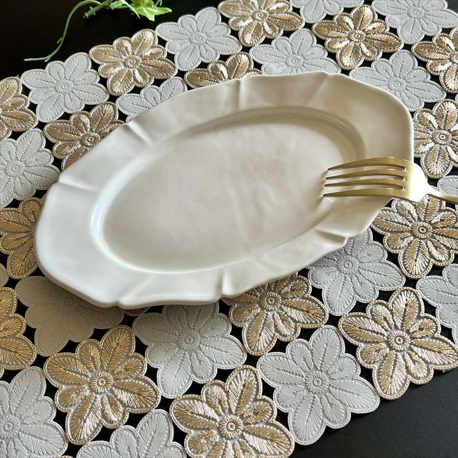 ゴールドとアイボリーの上品なフラワーモチーフを並べたデザインが華やかなプレースマット。