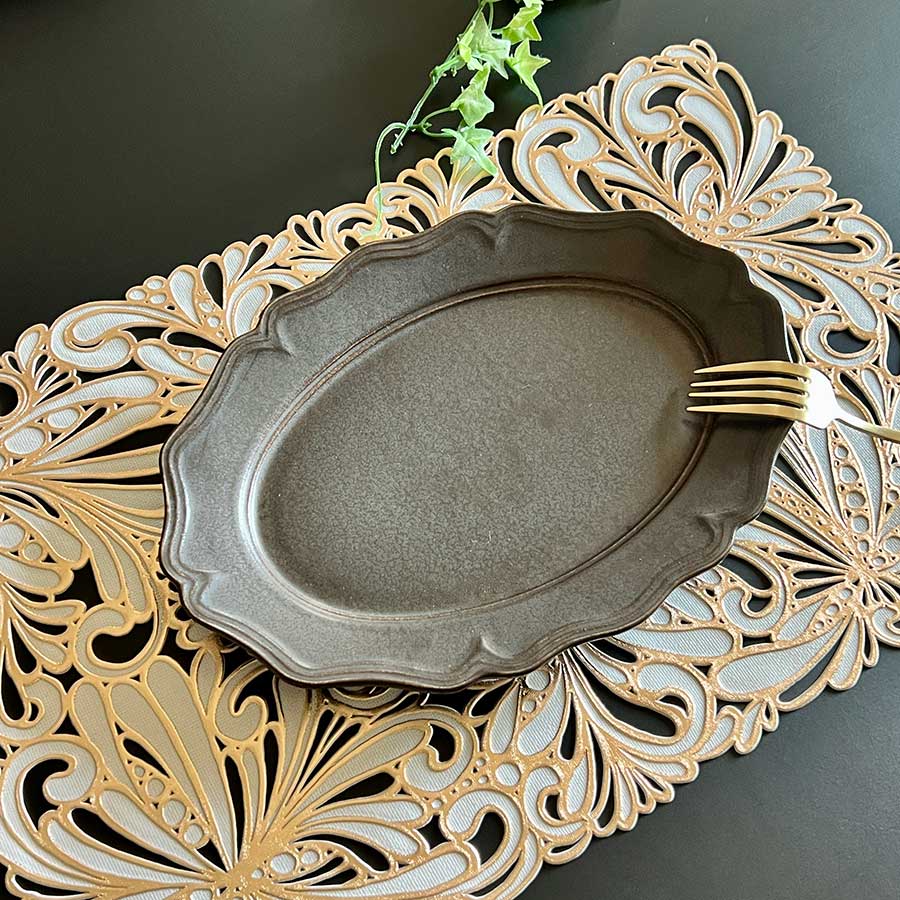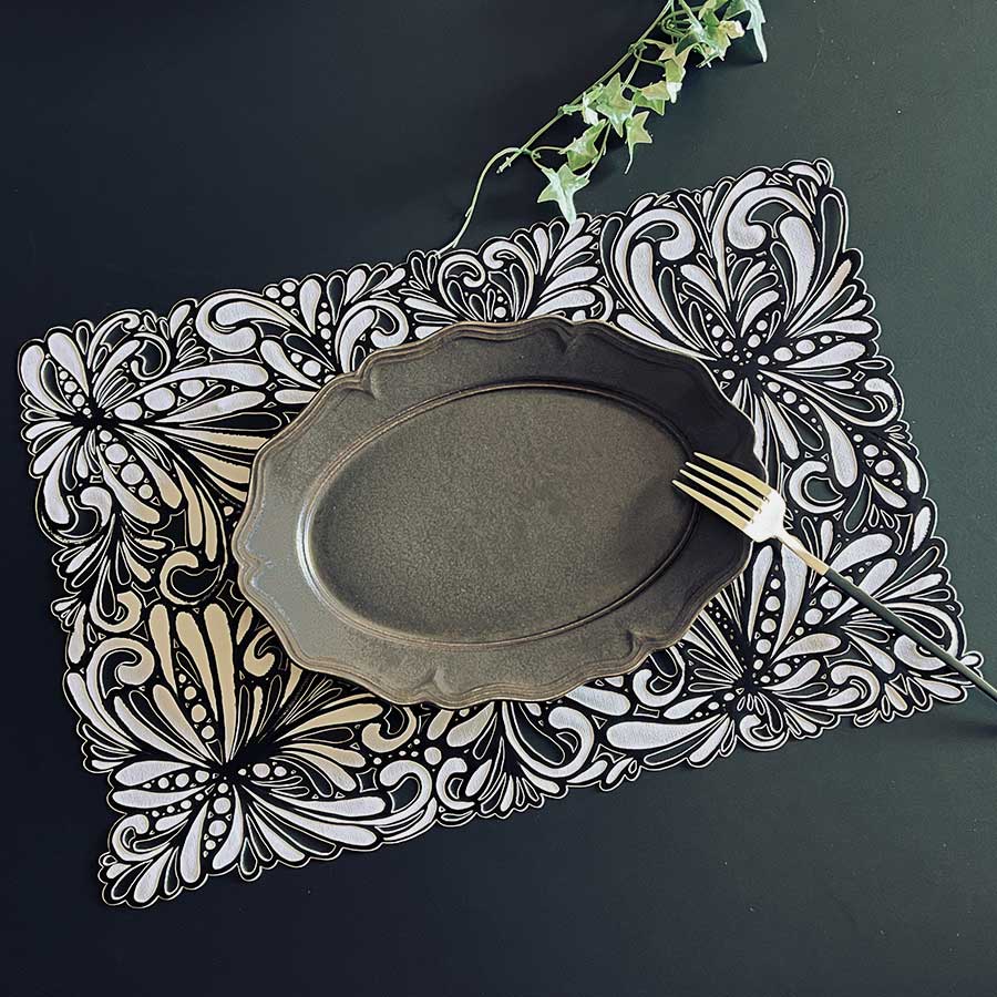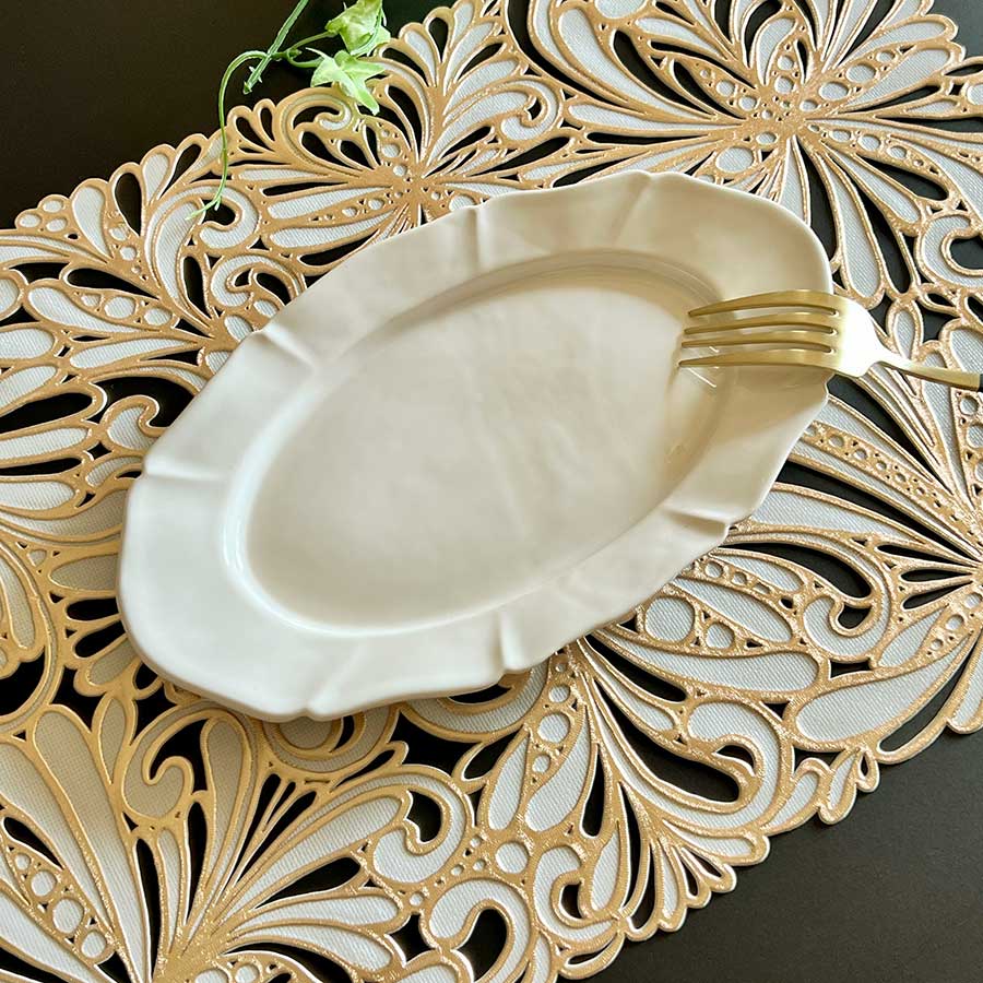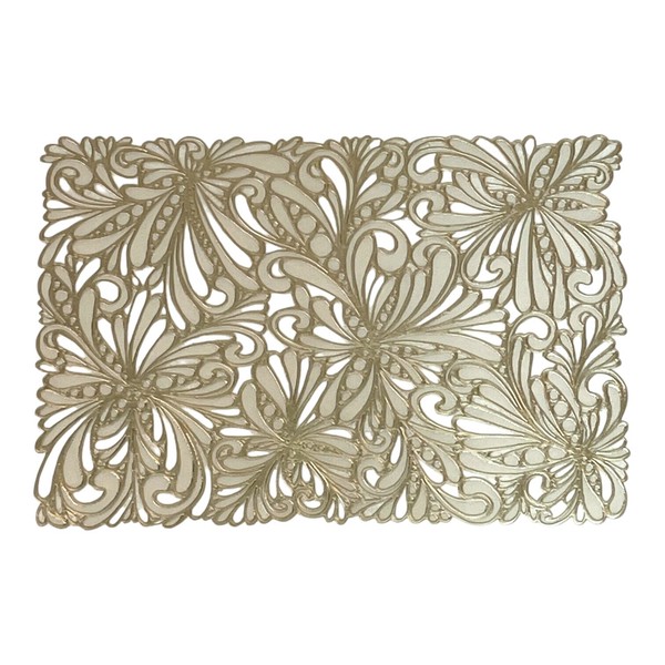 ゴールドとアイボリーの上品なフラワーモチーフを並べたデザインが華やかなプレースマット。