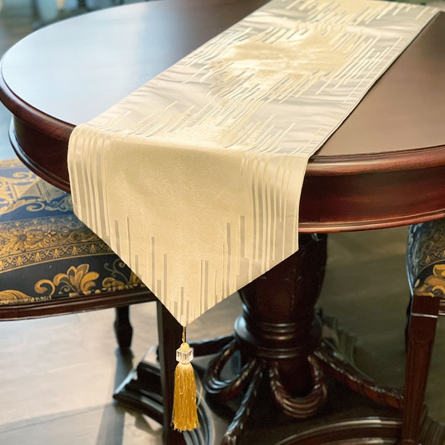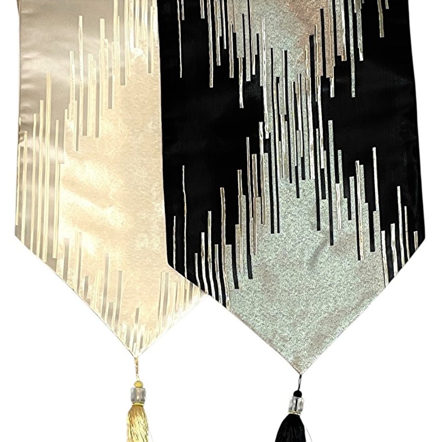 両端にはタッセルがあしらわれ、より華やかな仕上がりに。サイズは約34×208cmと大きめで、ダイニングテーブルやサイドボードにぴったりです。カラーはブラック・ゴールドとオフホワイト・ゴールドの2色展開。