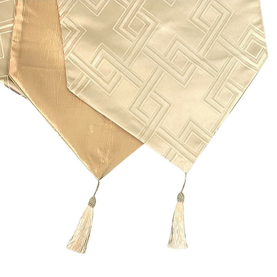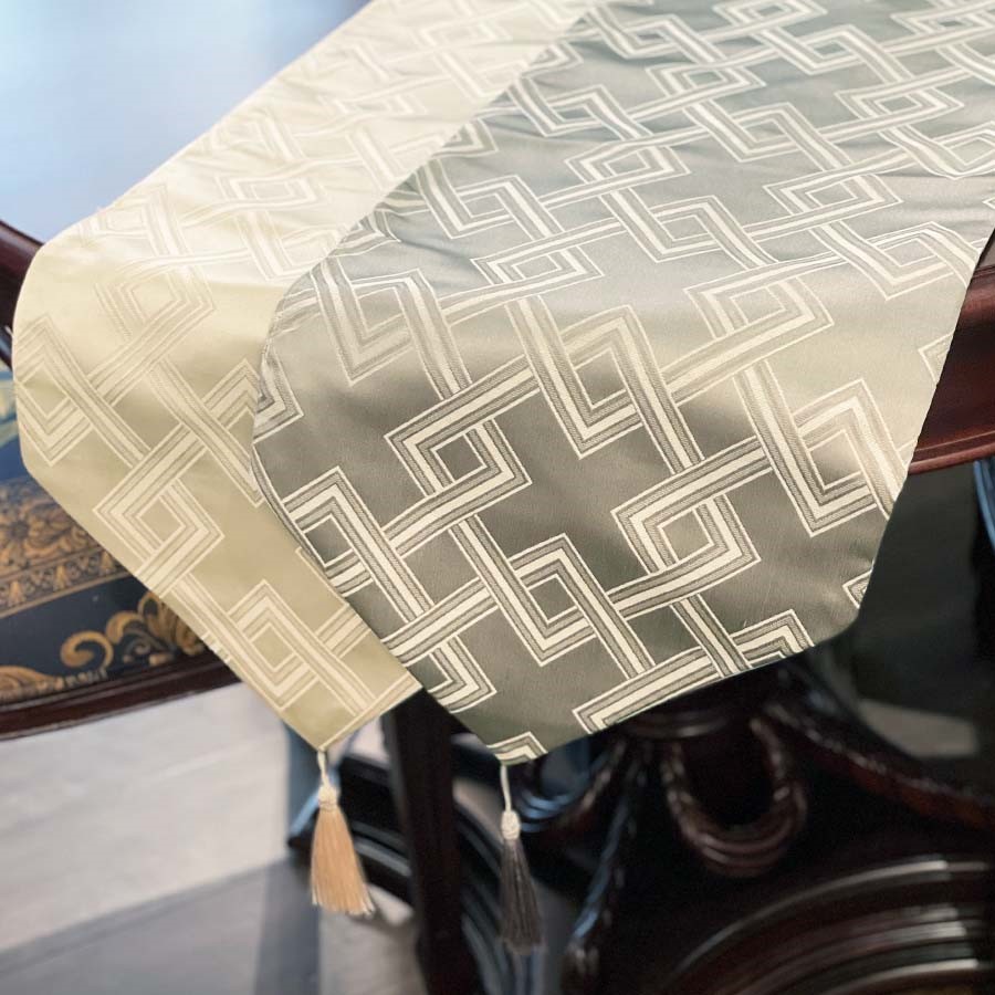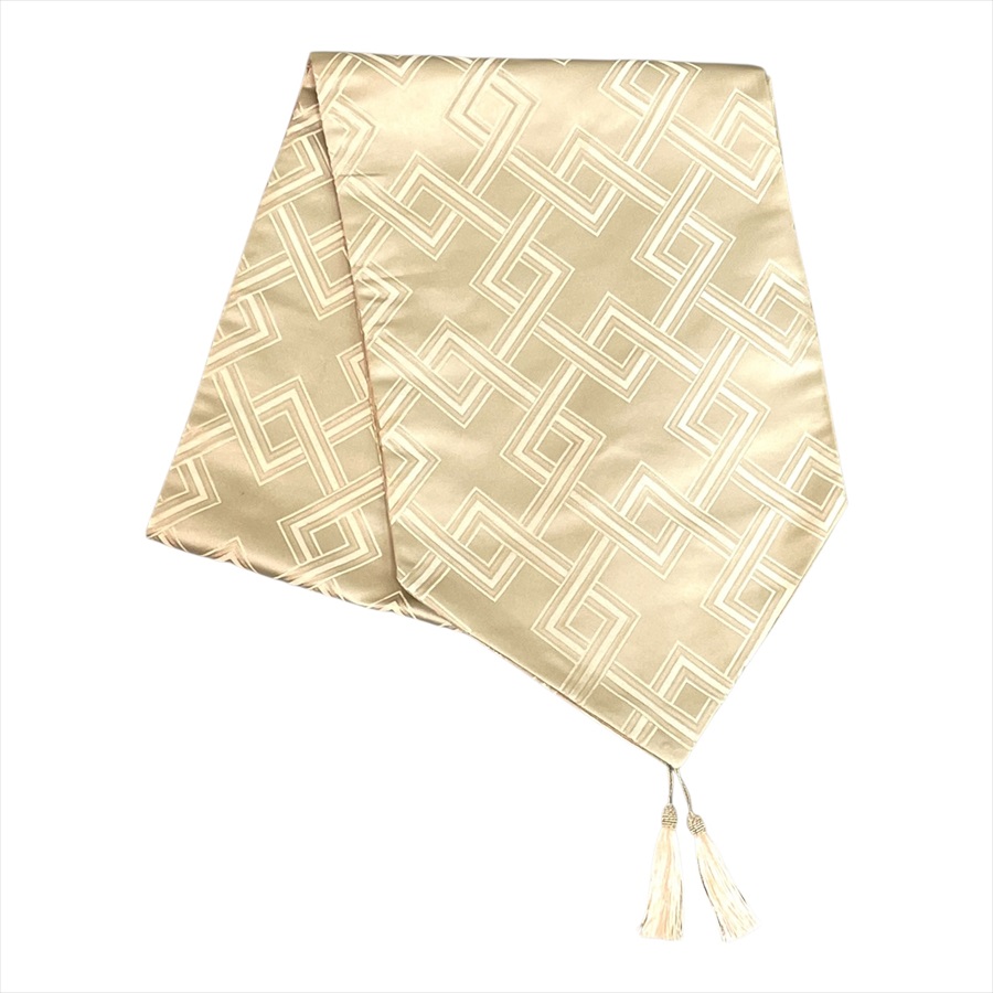 光沢のある生地と立体感のあるデザインが、テーブルコーディネートにモダンなアクセントを添えます。両端には存在感のあるタッセルが付いており、優雅で高級感のある雰囲気を演出します。カラーはシックなグレーと、柔らかなアイボリーの2色展開。シンプルでありながら洗練されたデザインは、洋風・和風どちらのインテリアにも合わせやすいのが魅力です。