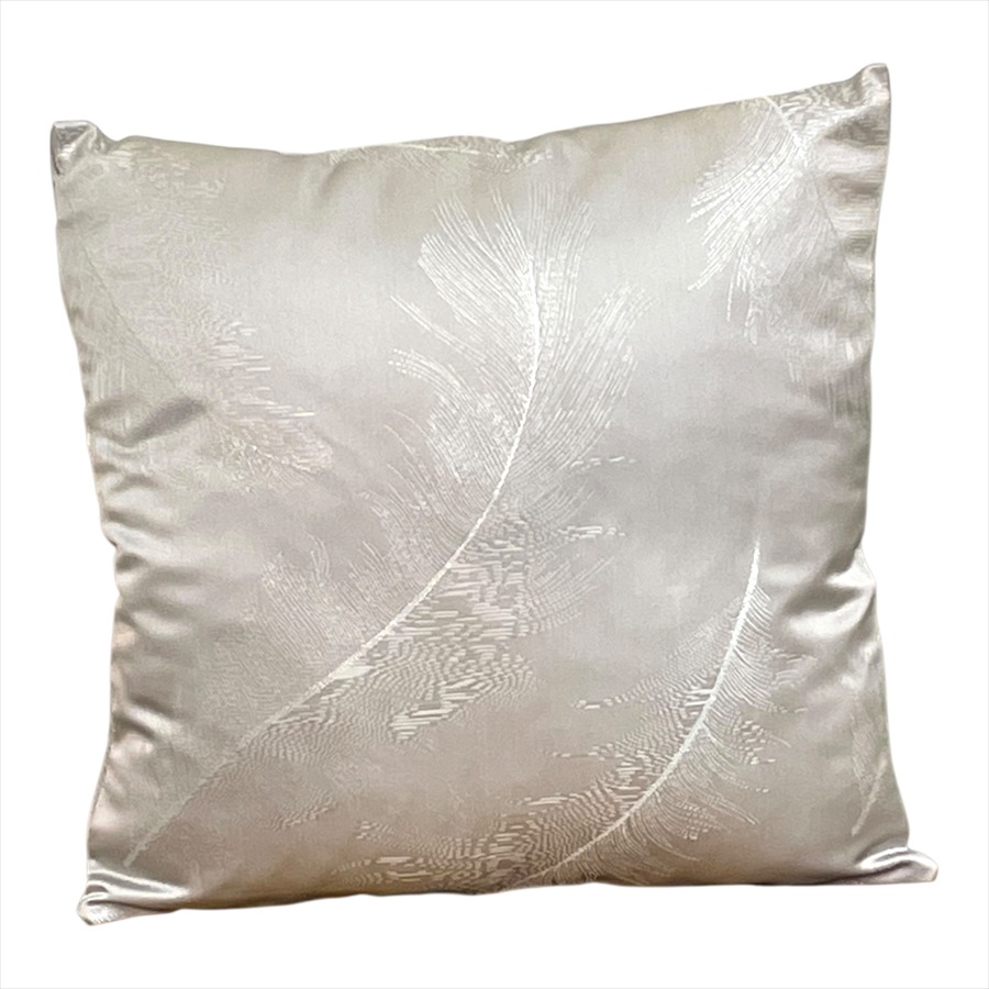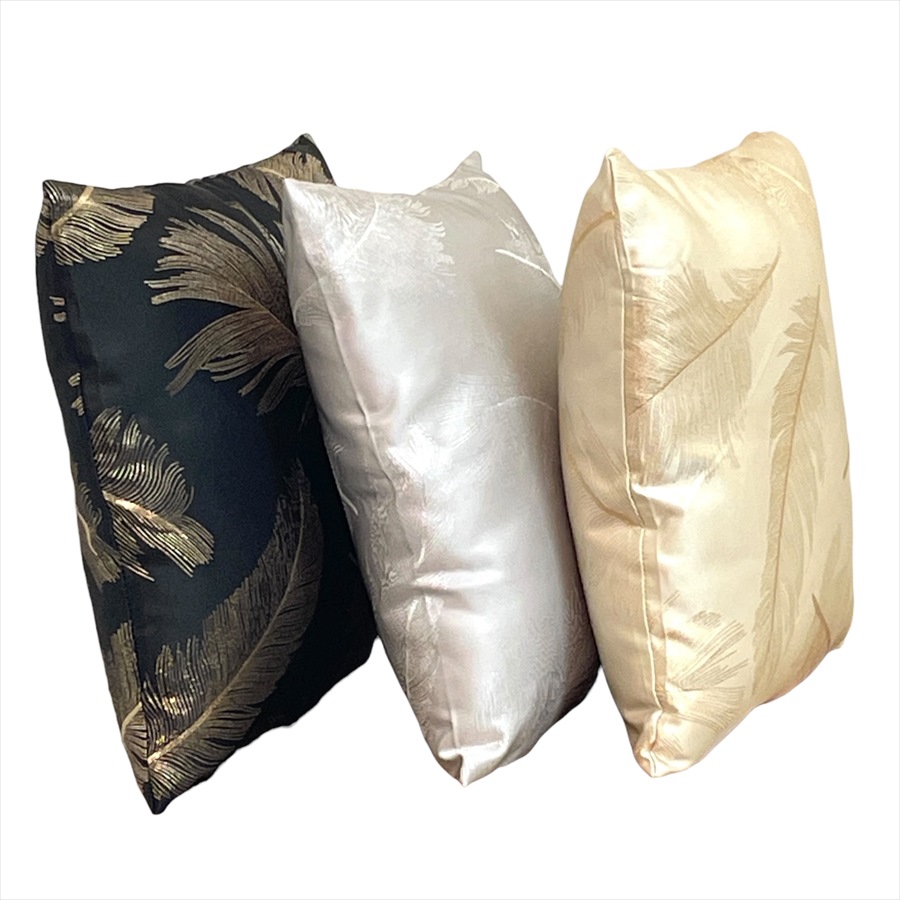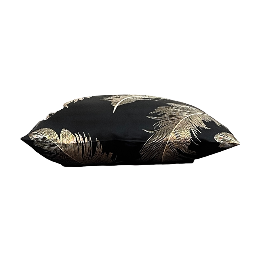 羽根のモチーフを上品にあしらった、エレガントなクッションカバー。艶やかな生地に立体感のある刺繍が映え、ソファやベッドを一層ラグジュアリーに演出します。ファスナー式でお手入れも簡単、中材付きですぐにご使用いただけます。