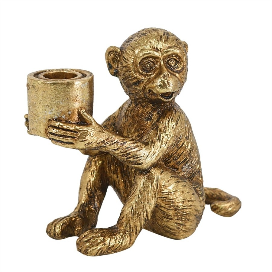 上品なアンティークゴールドの輝きが印象的な、ユーモラスな表情のモンキーキャンドルホルダー。