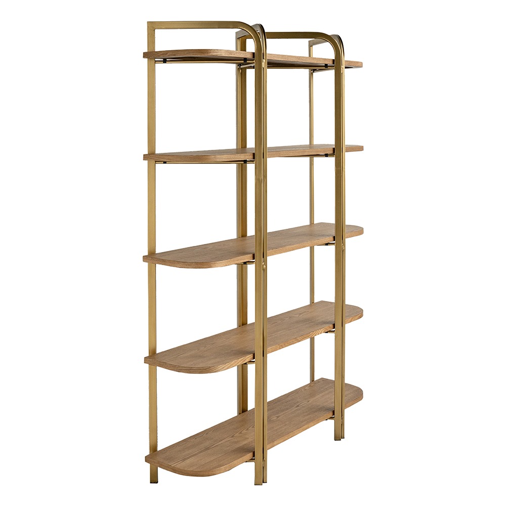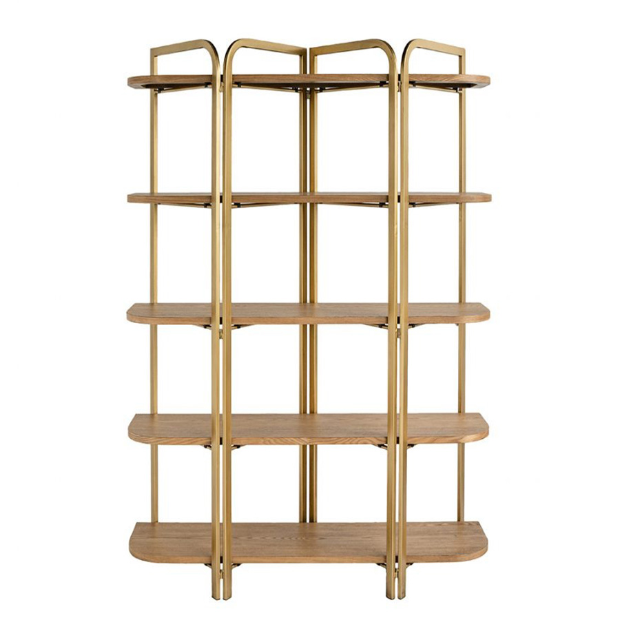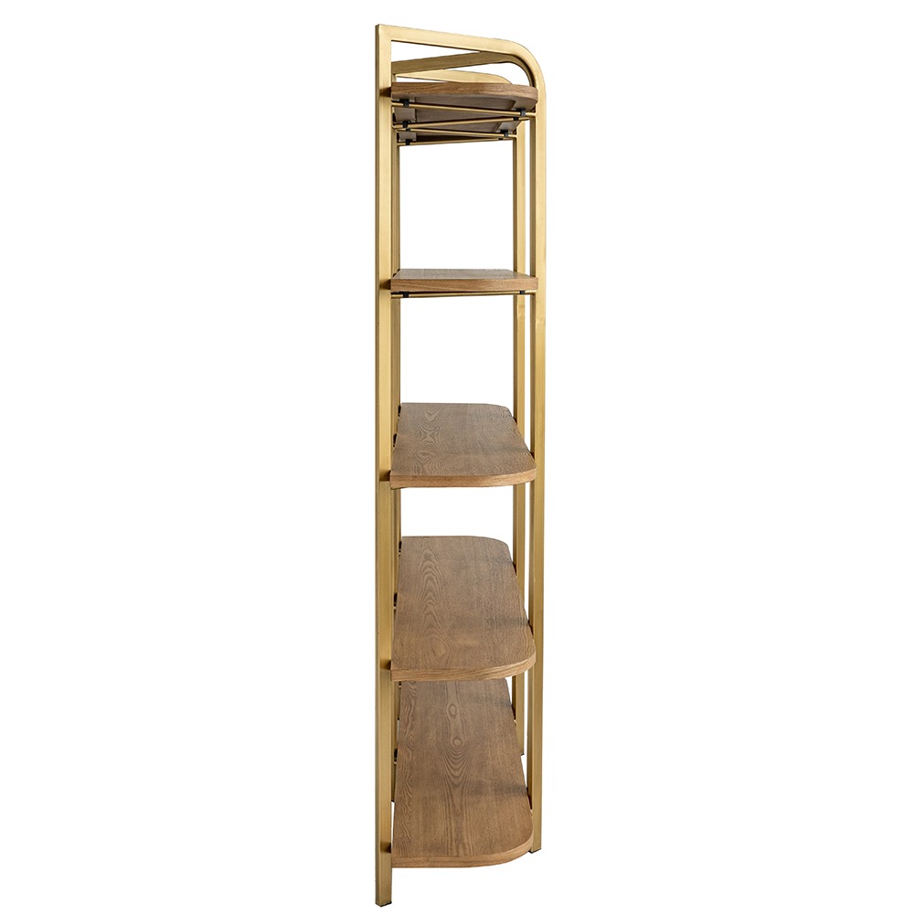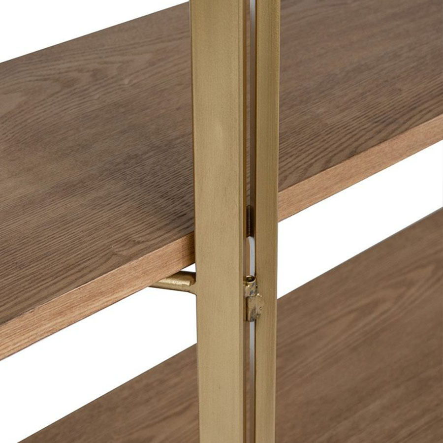 上品なゴールドフレームとナチュラルウッドの組み合わせが印象的な、クラシックモダンなシェルフ。
