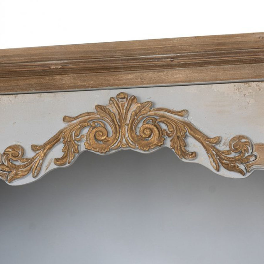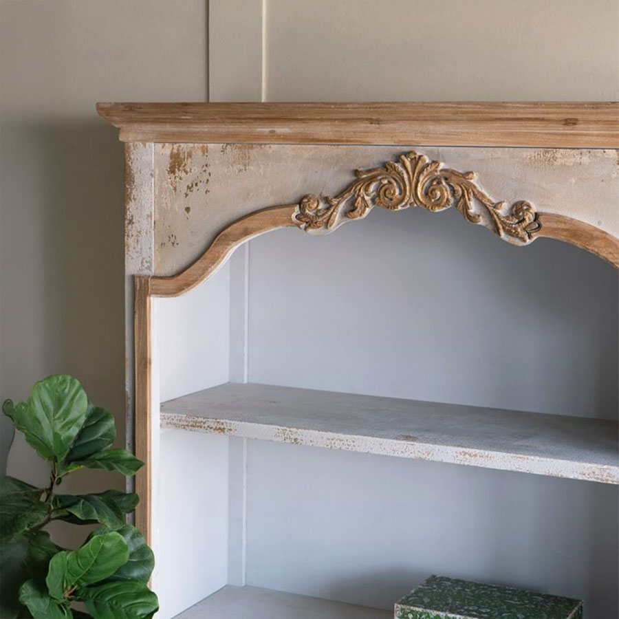 上部の優雅な装飾と、くすんだシャビー仕上げが印象的なフレンチスタイルのシェルフです。