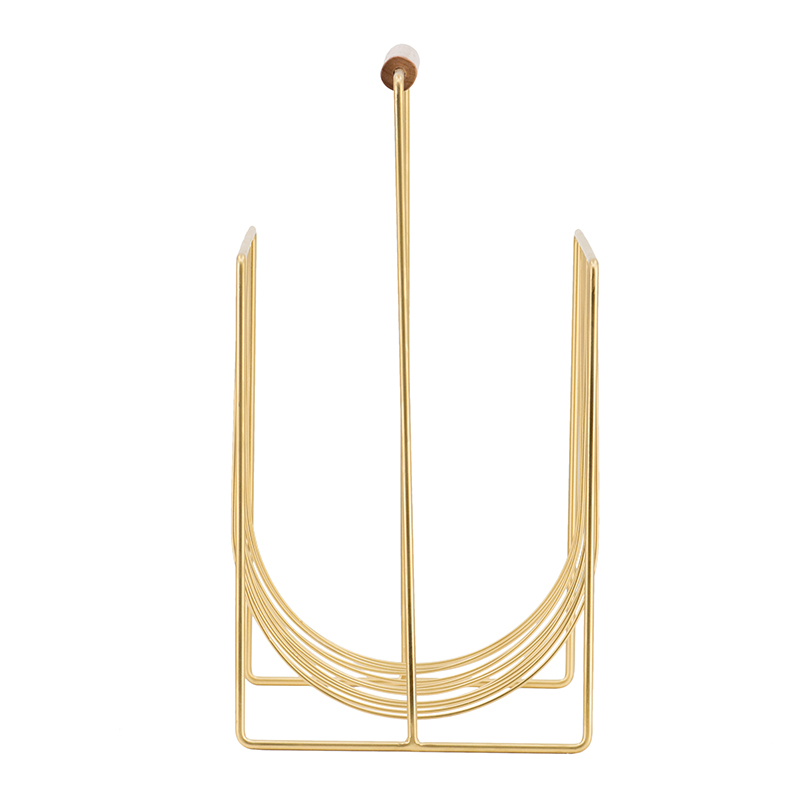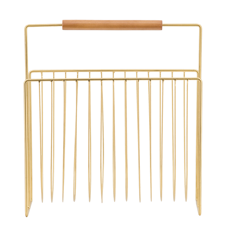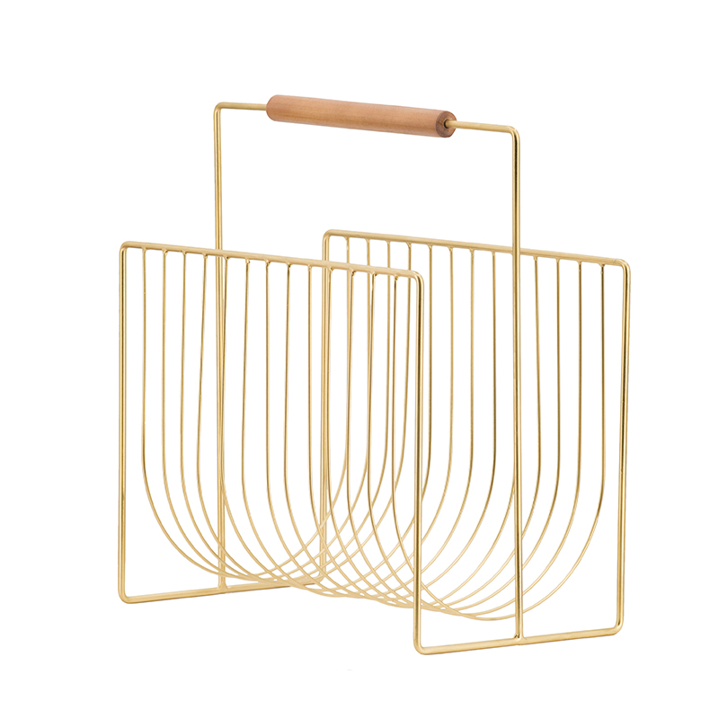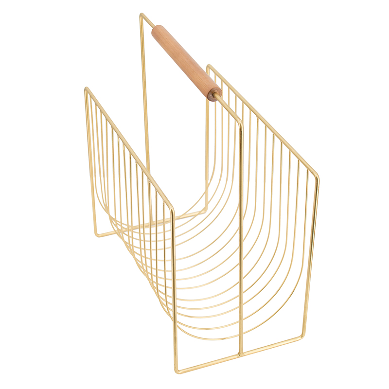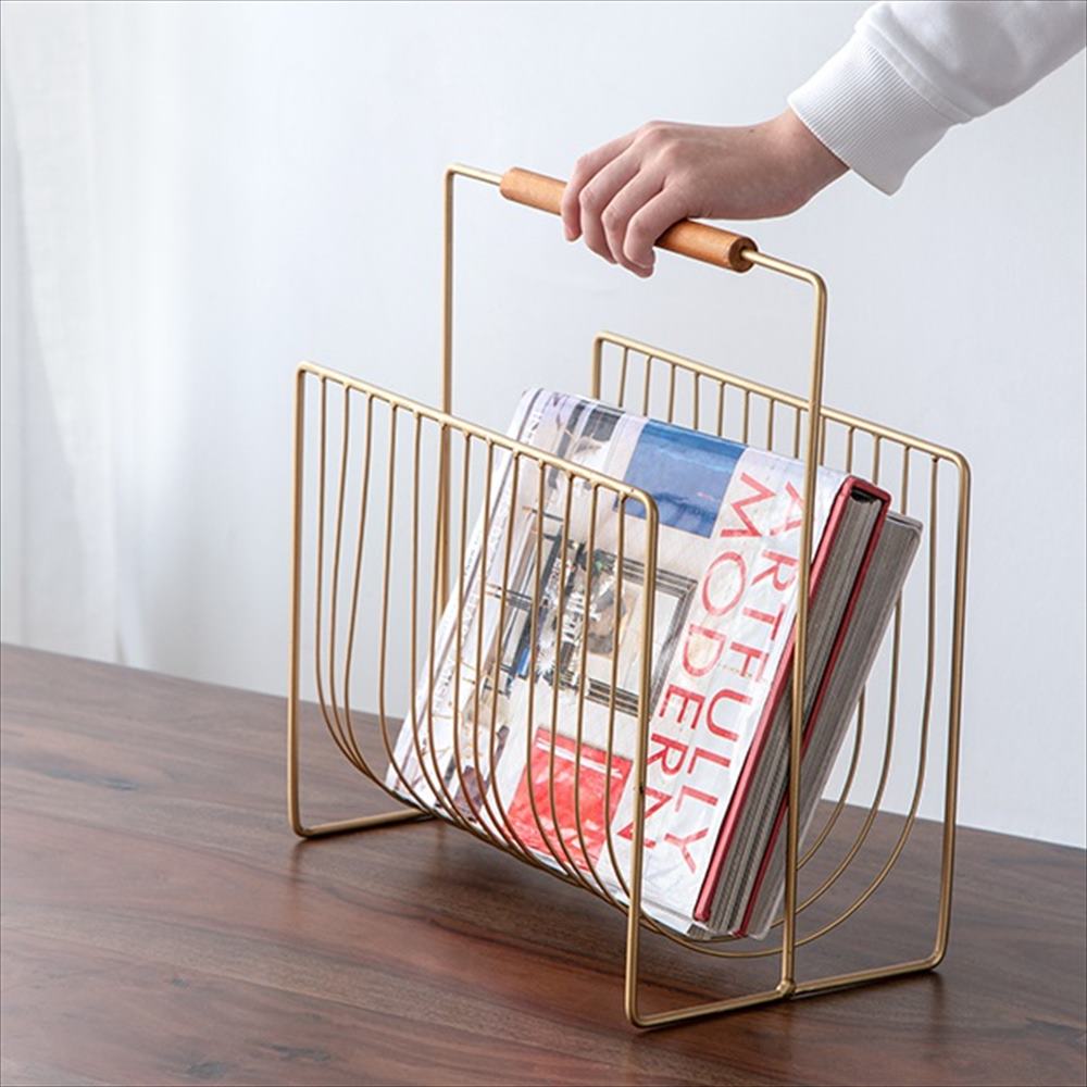 このUワイヤーメタルマガジンラックは、木製のハンドルとゴールド仕上げのなめらかで現代的なデザインが特徴です。