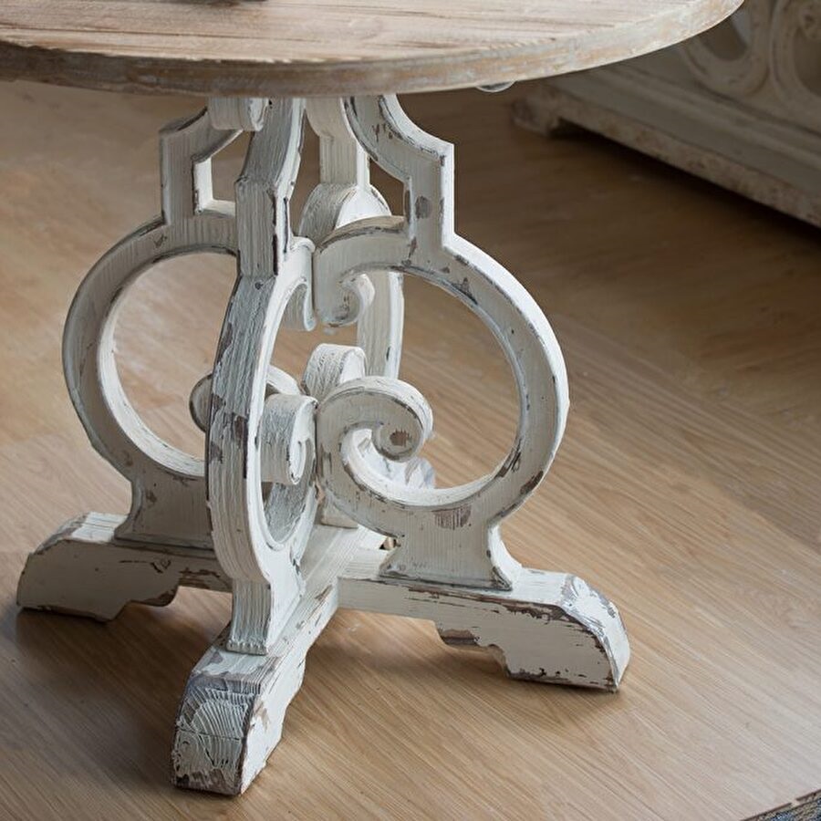 デザイナーこだわりの木製の彫刻のようなベースとホワイトを基調とした滑らかな円形の天板の組み合わせ。