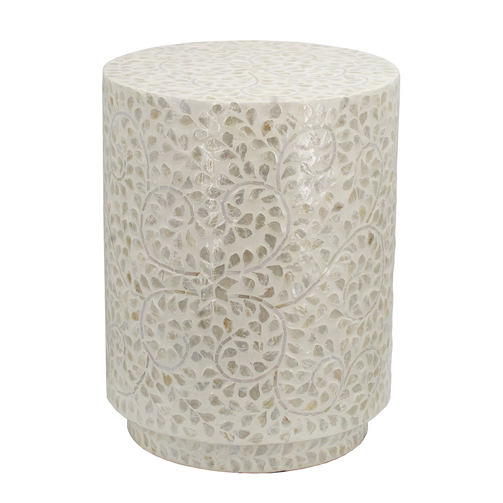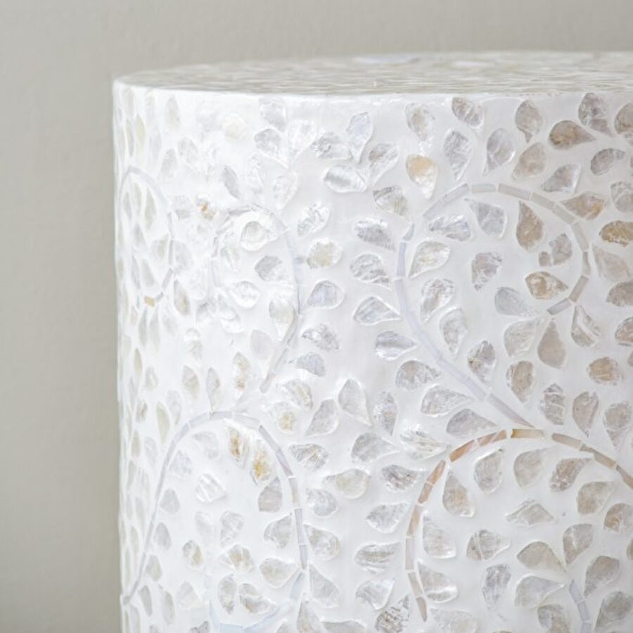 白いフレームに美しいカピスのインレイがアクセントを添える、すっきりとしたデザインの円形アクセントテーブル。