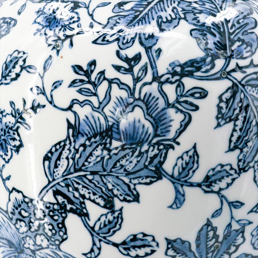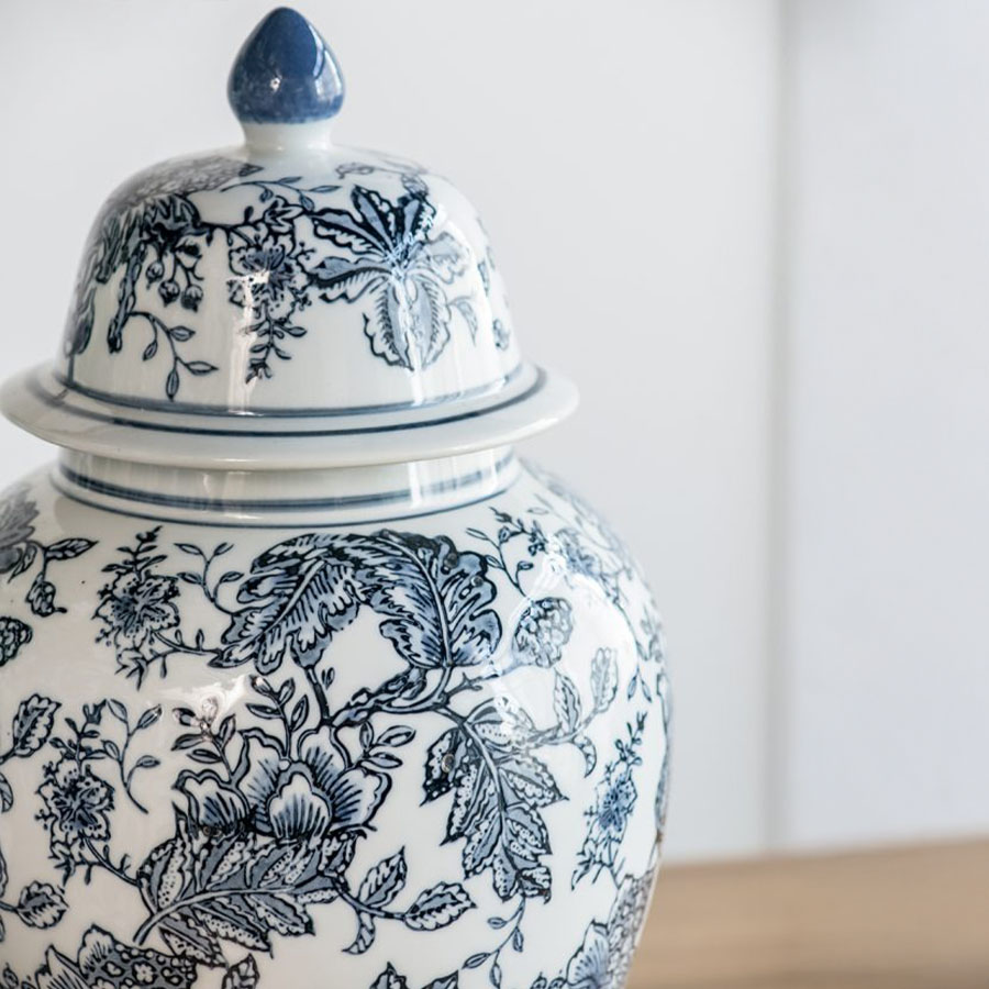 気品あふれるブルーのフローラル柄が美しい、磁器製のジンジャージャー(蓋付き壺)です。
