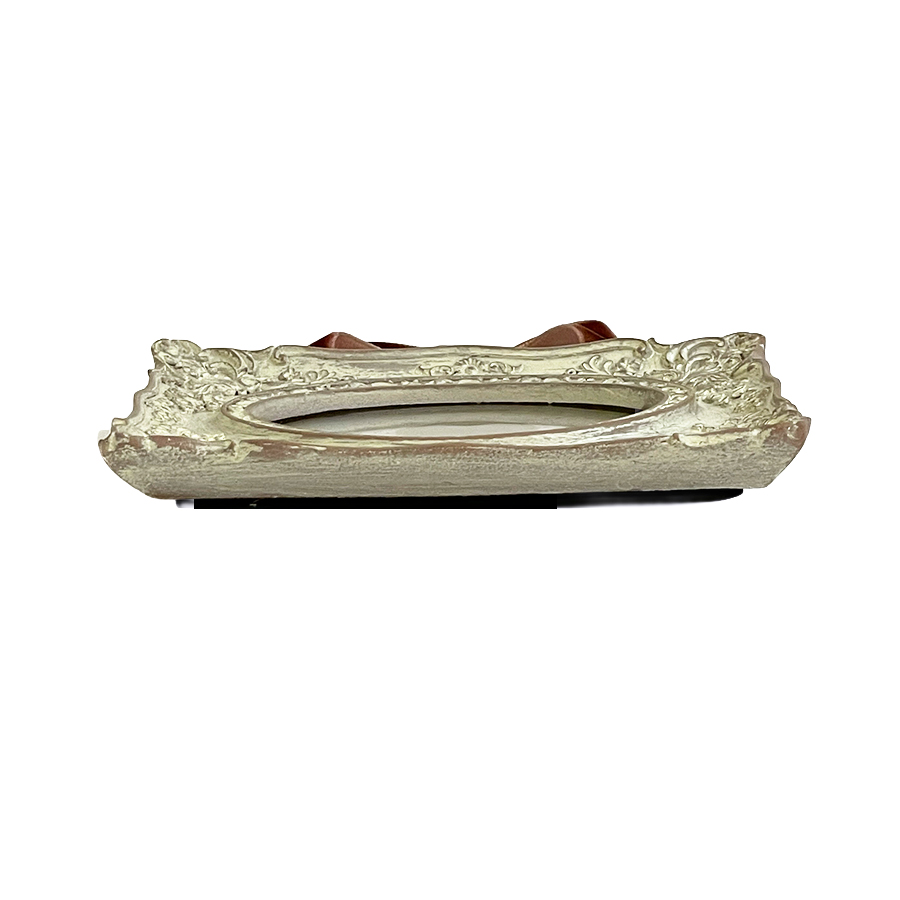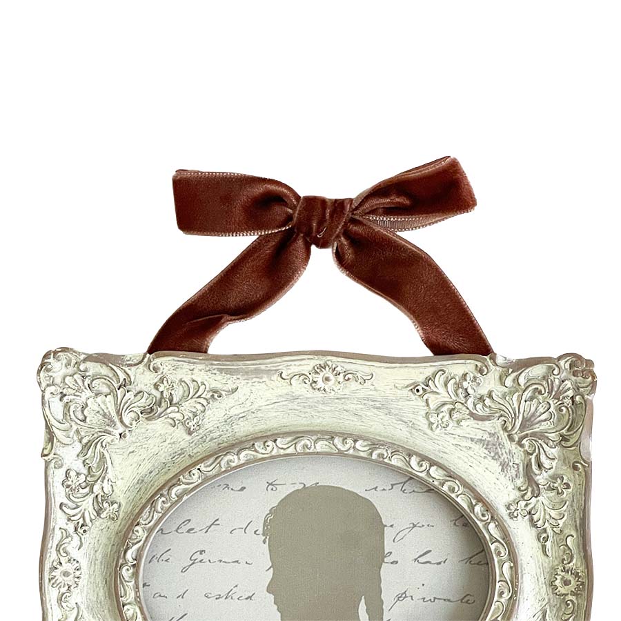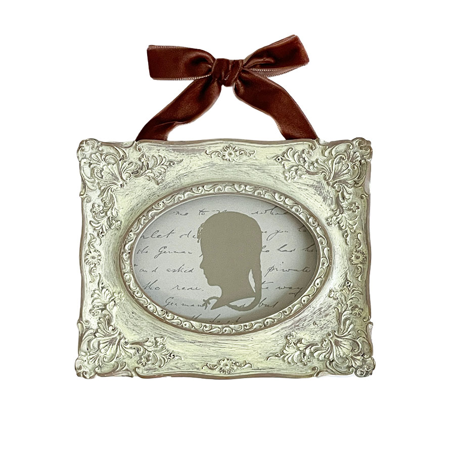 クラシックな装飾が美しい、アンティーク調のミニフレームです。 繊細なレリーフが施されたフレームに、上品なベルベット風リボンを組み合わせ、壁面をエレガントに飾るアクセントとして活躍します。