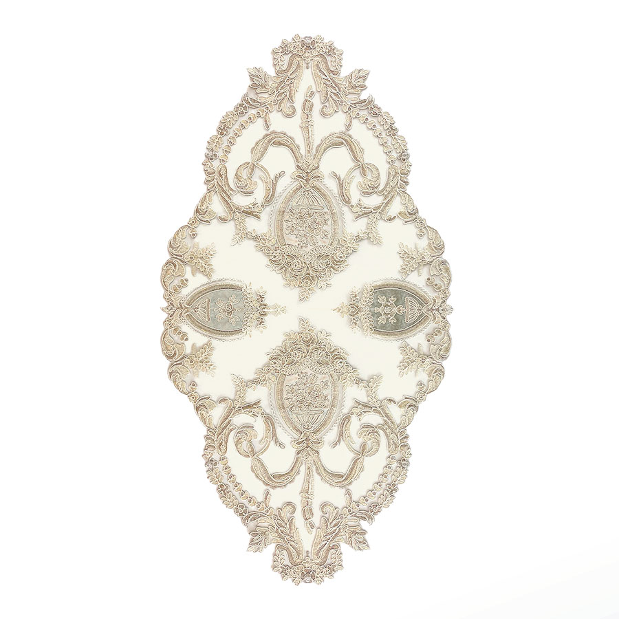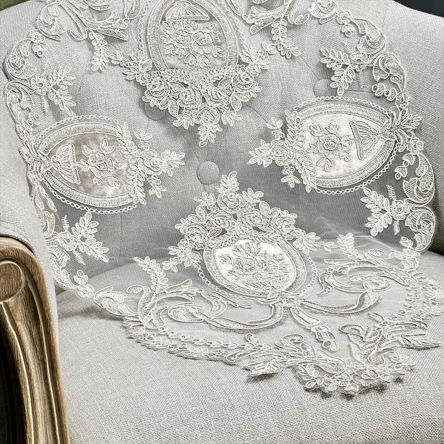 立体感のある刺繍と透け感の美しいレースが重なり合い、アンティーク調やエレガントなインテリアと相性抜群。
