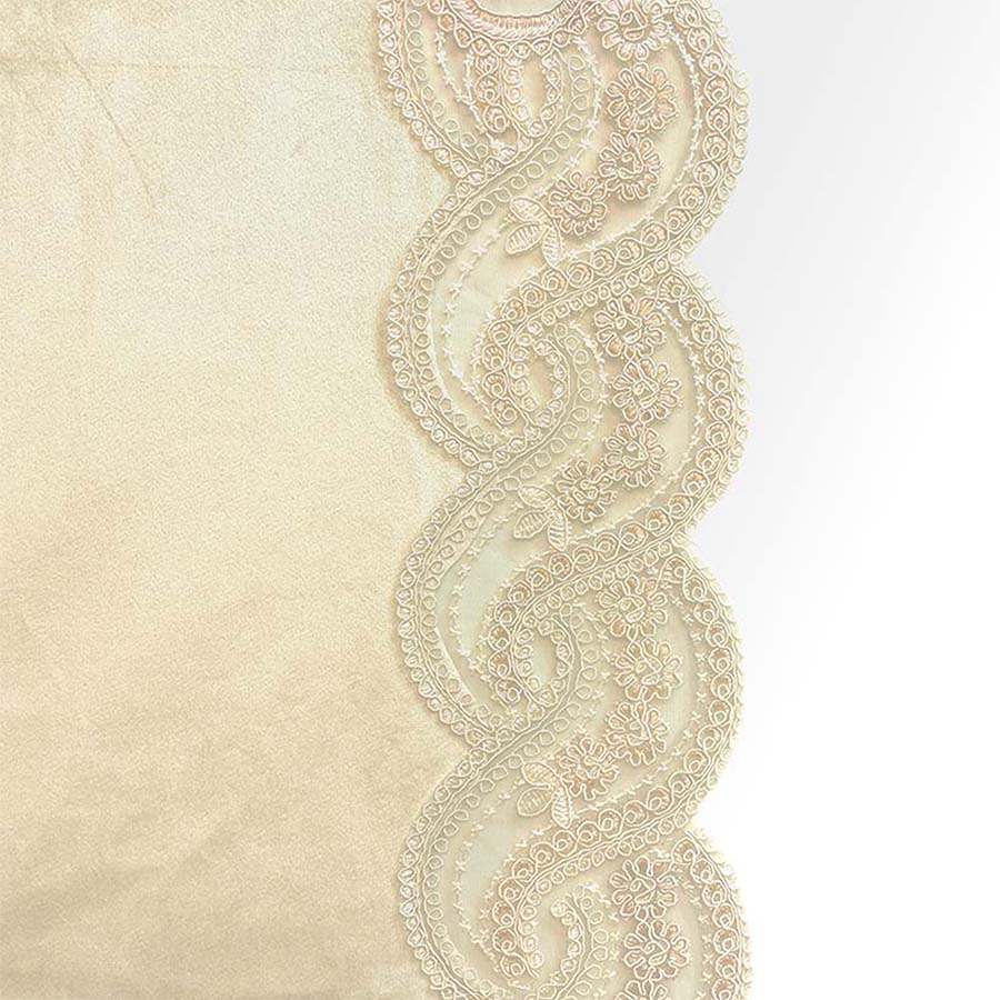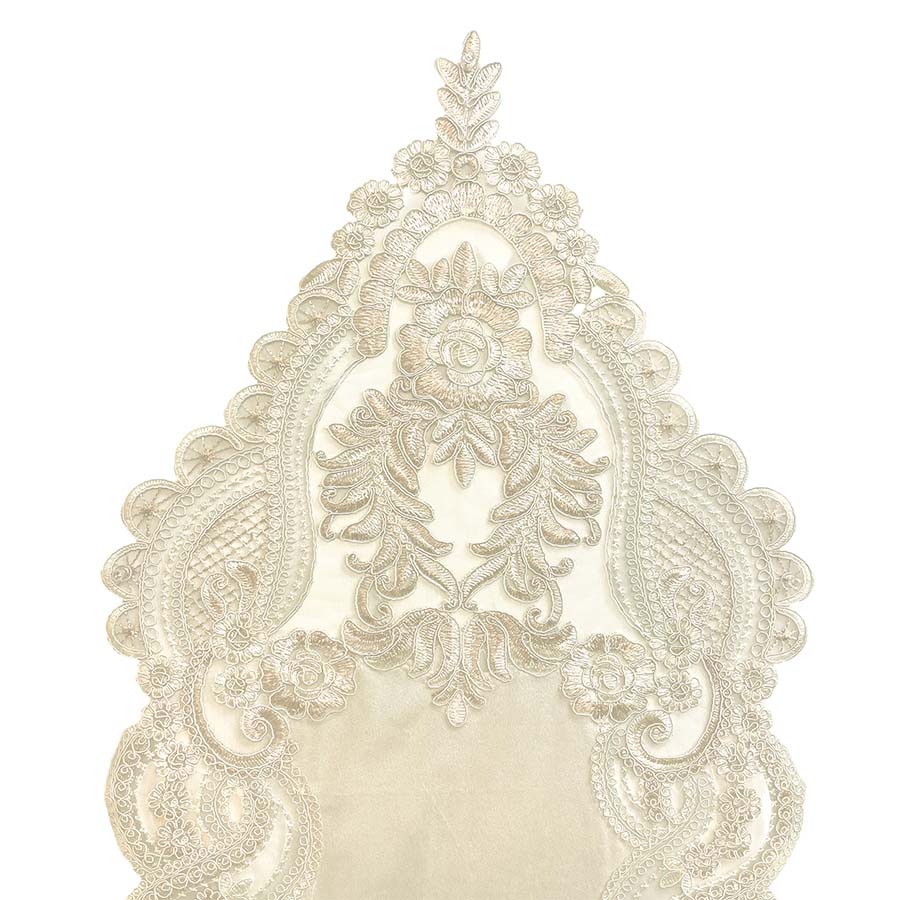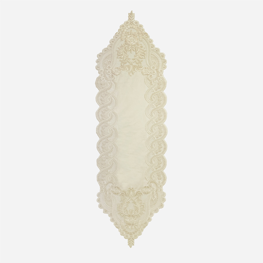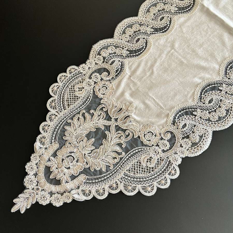 上品な光沢を放つベロア素材に、繊細で華やかなレースを贅沢にあしらったテーブルランナー。