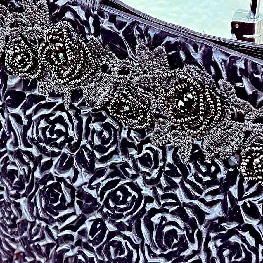 立体感のあるローズ柄フロッキーに、繊細なビーズ装飾をあしらった日本製・フォーマル対応A4バッグ。