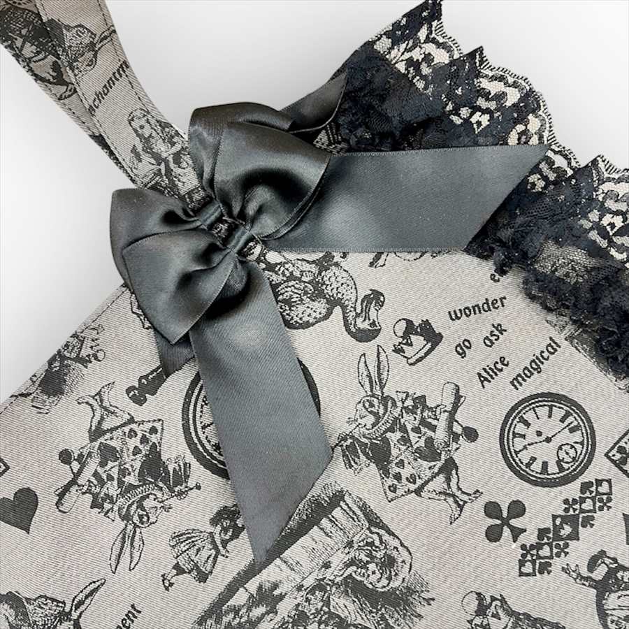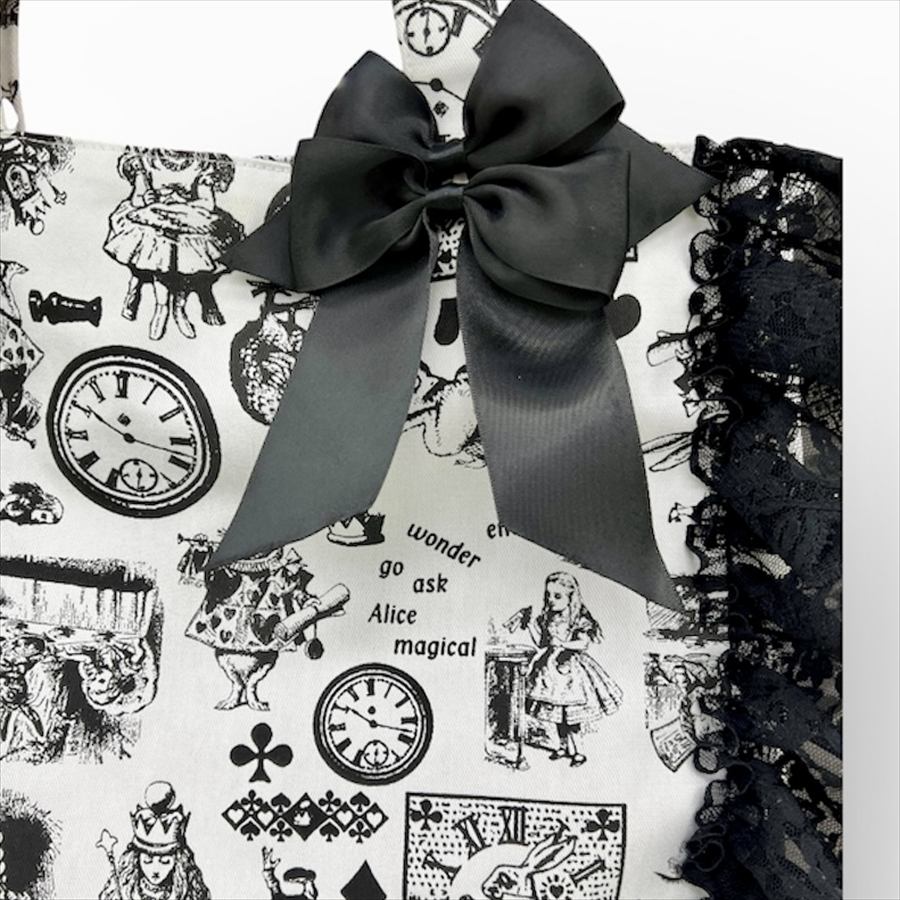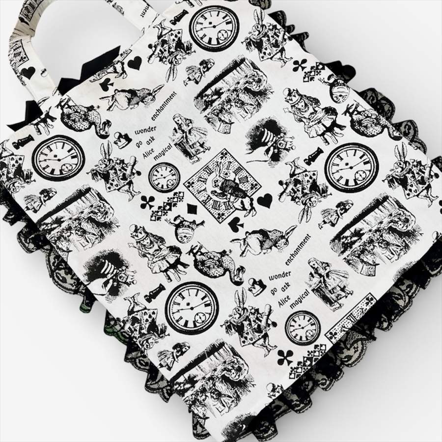 「不思議の国のアリス」の世界観をシックなモノトーンプリントと繊細なレースで表現した、マルチプリントトートバッグ。