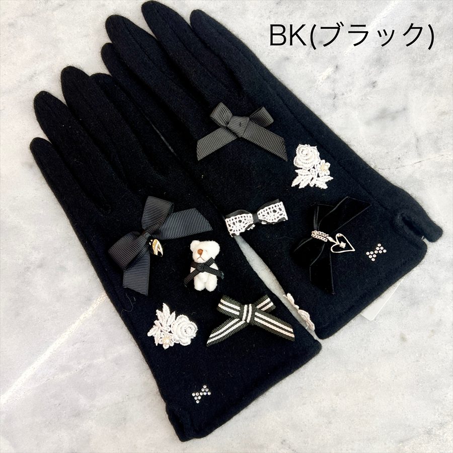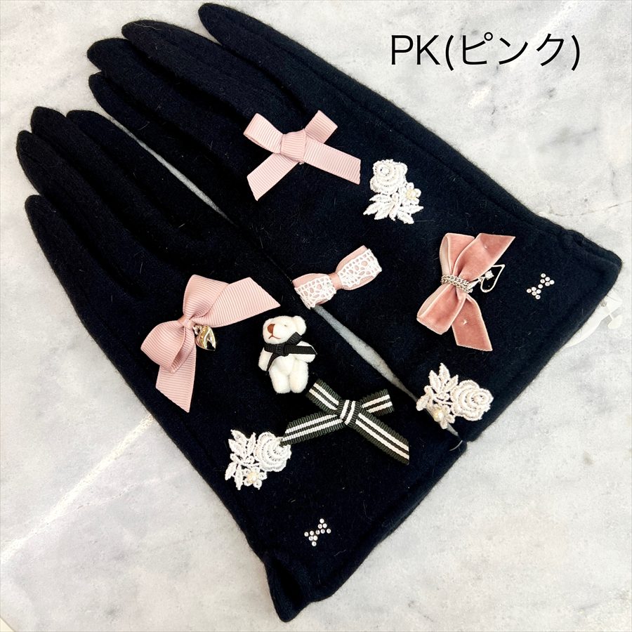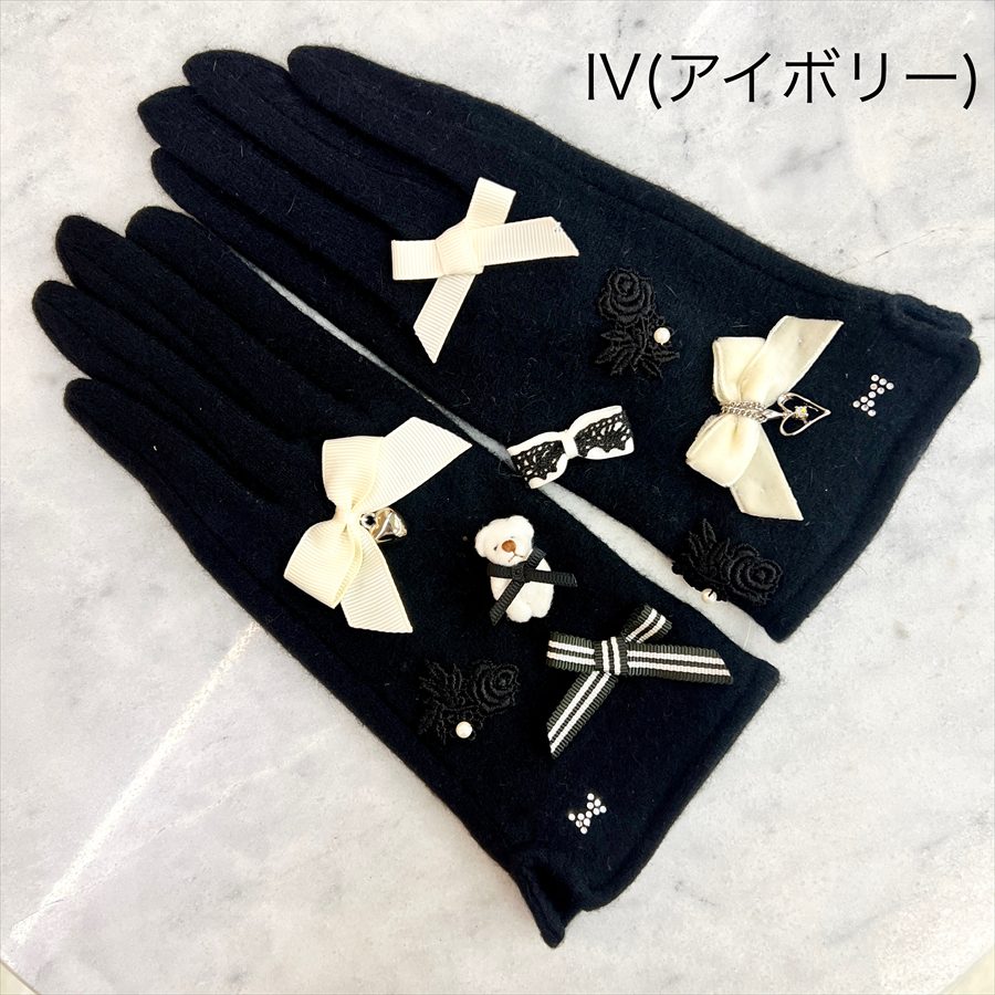 ふわふわのミニクマと、上品なリボンがちりばめられた大人可愛いデザインの手袋。