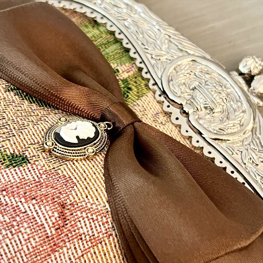 大きなリボンにカメオのモチーフが付いたクラシカルで可愛いデザインになっています。