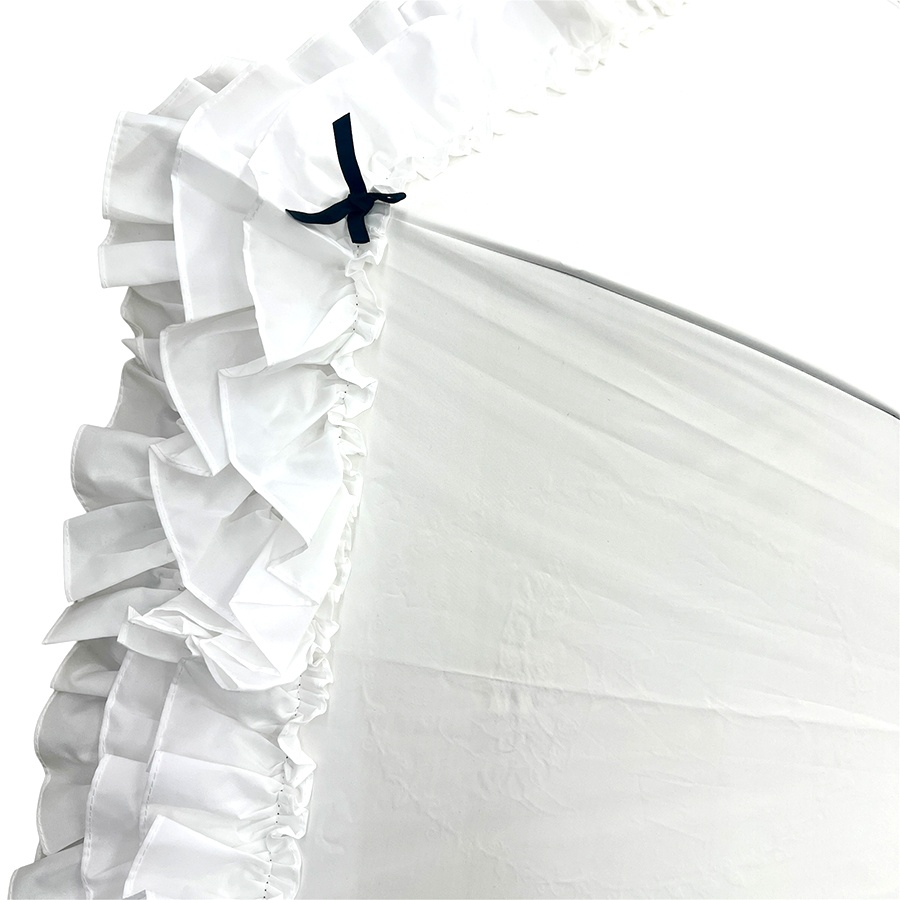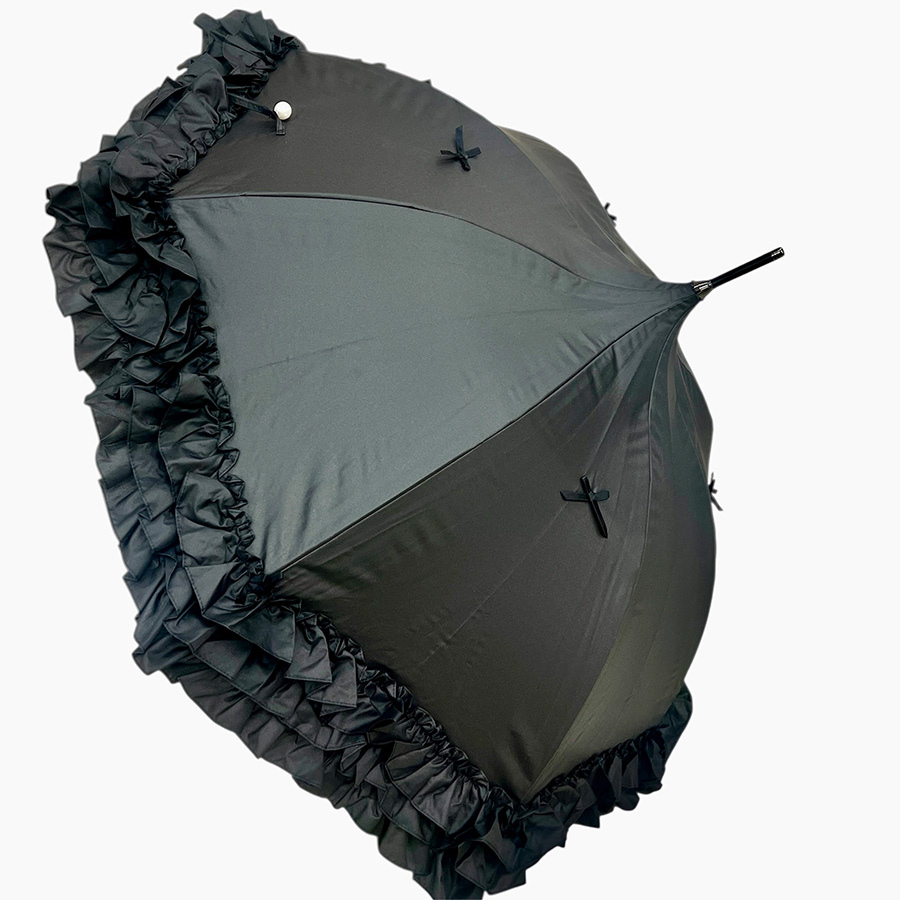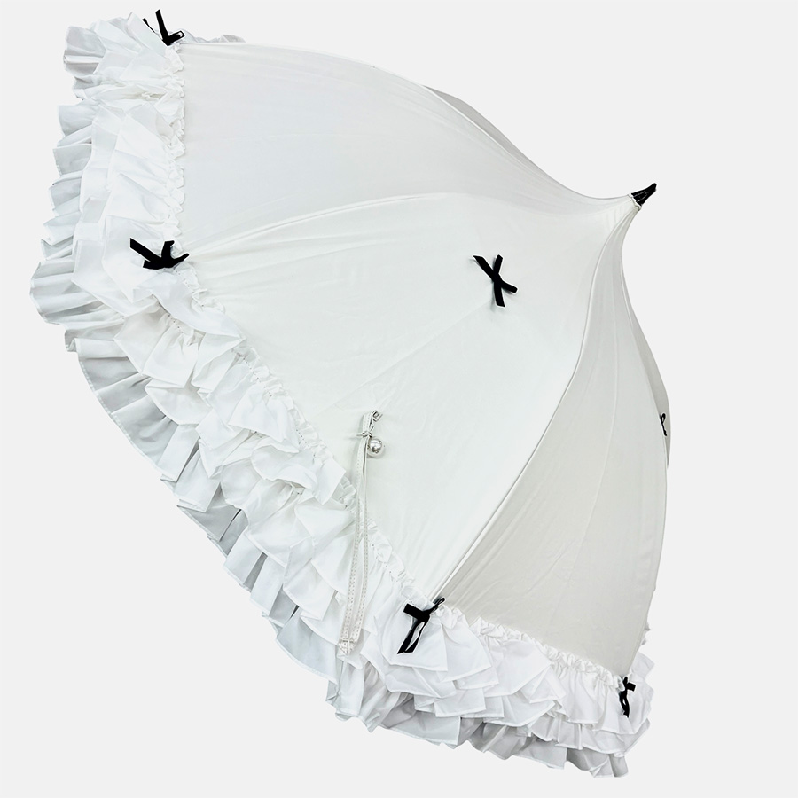 クラシカルなパゴダ型に、フリルとリボンをあしらった上品なデザインの一級遮光傘。