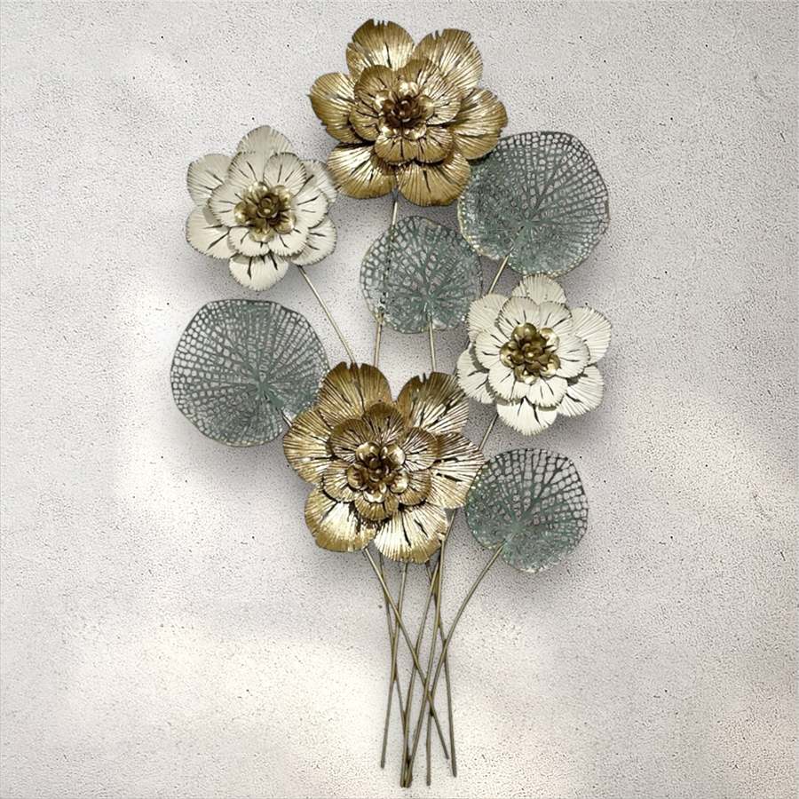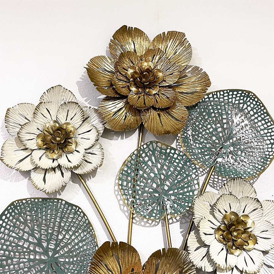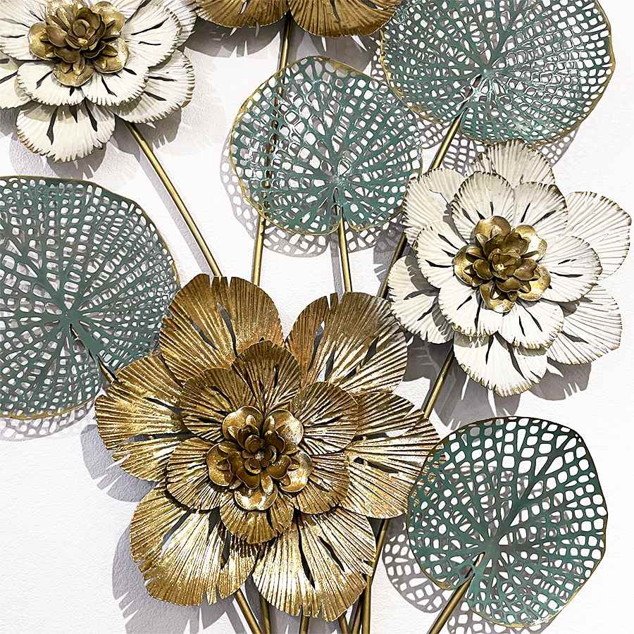 ゴールドとホワイトを基調とした花と、透かし模様の葉が重なり合い、壁面に華やかさと奥行きを演出します。
