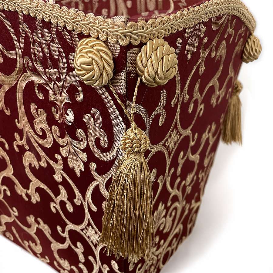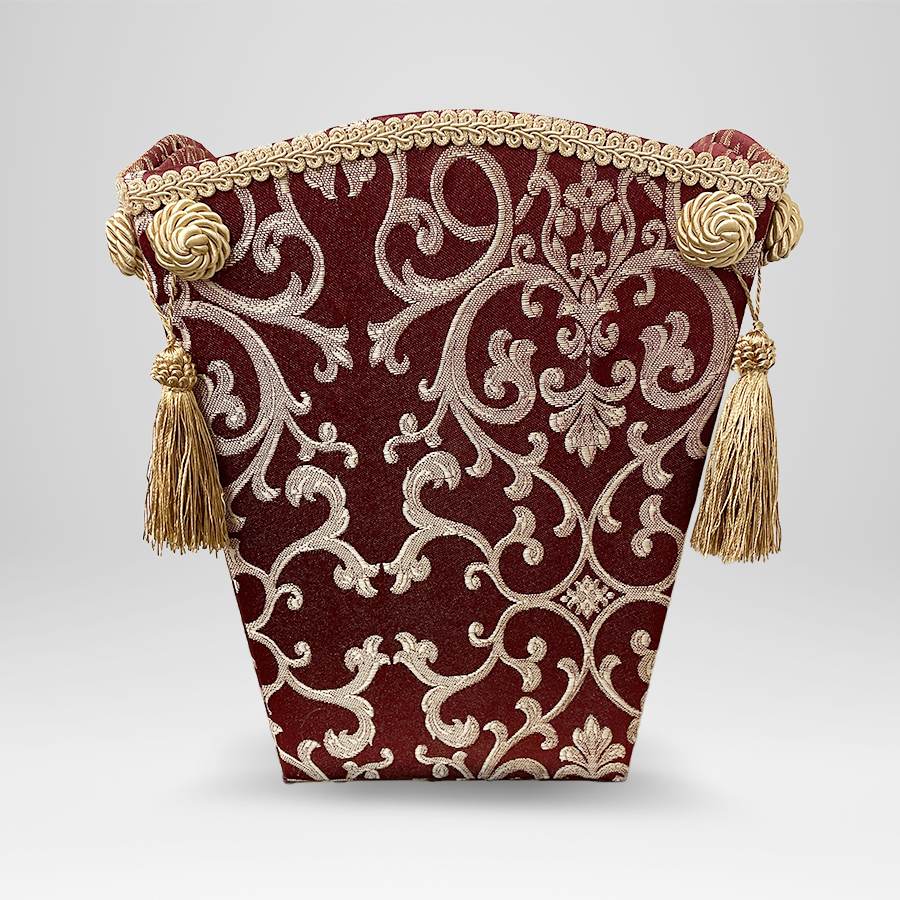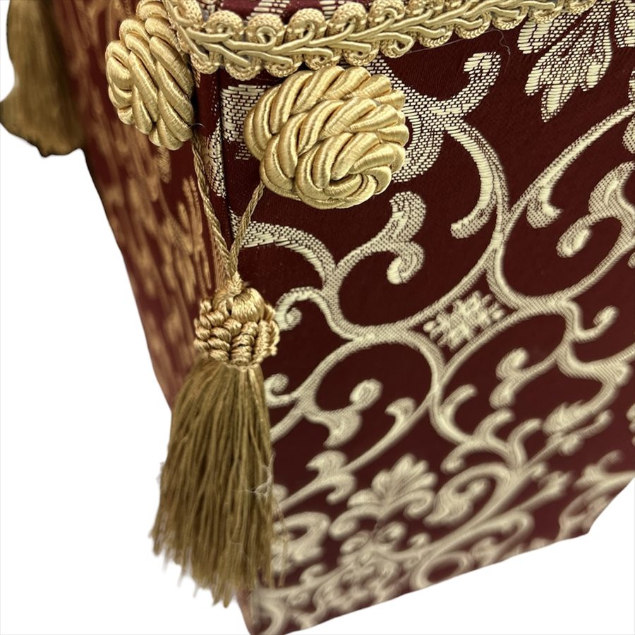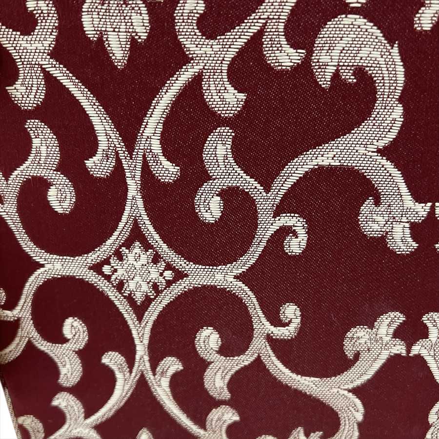 イタリアの伝統的なアラベスク模様を施した深い赤の布地を使い、クラシックで落ち着いた仕上がりが印象的です。