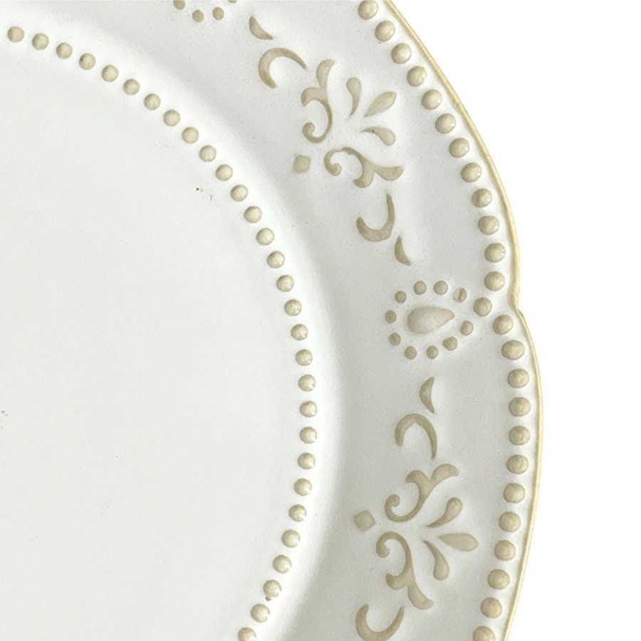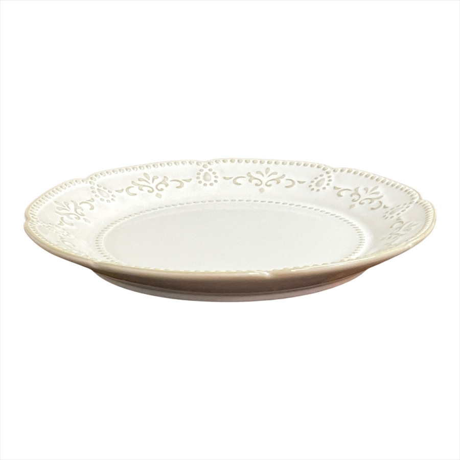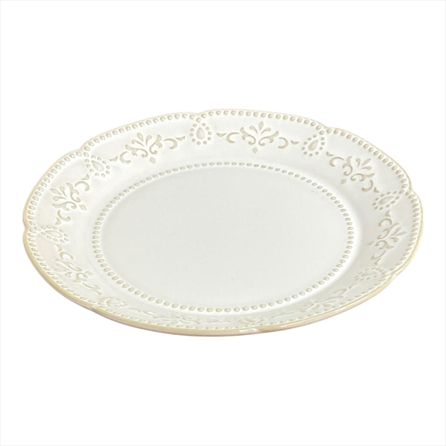 縁に施された繊細なドットとレリーフが美しい陶器のプレート。