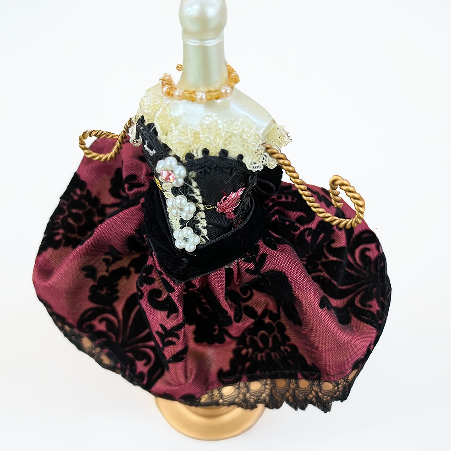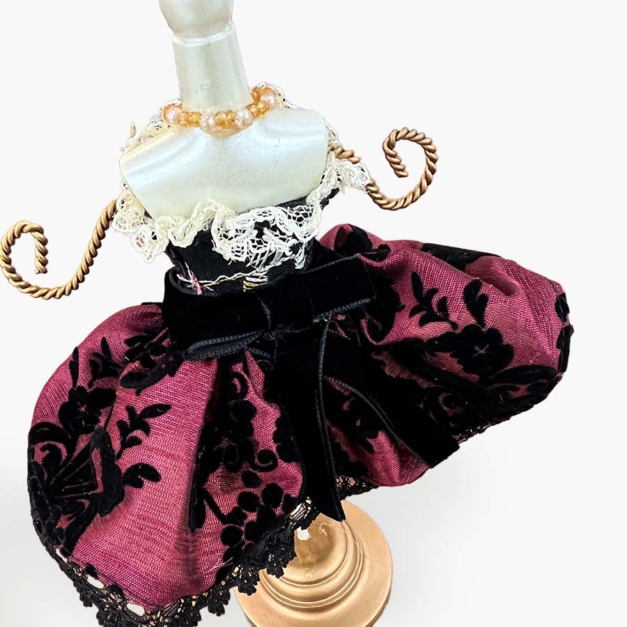 クラシカルなドレスを纏ったような、美しいアクセサリー用ミニトルソー。ボルドーカラーの生地にブラックのアラベスク模様をあしらい、繊細なレースやパール、巻きバラで上品に仕上げました。