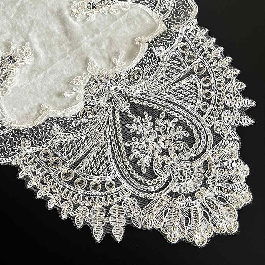 チュールレースに純白のベロア生地と刺繍を施した、可憐で美しいチュールレースのテーブルセンター。