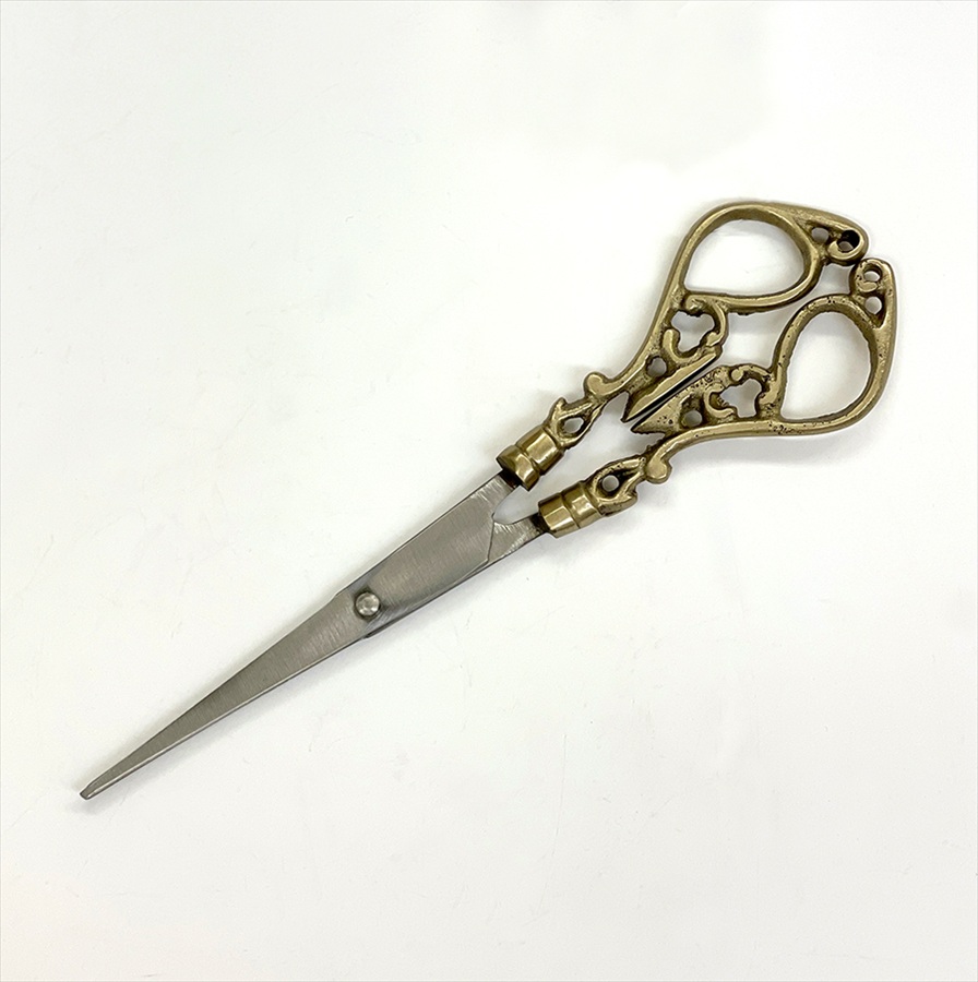持ち手は真鍮製で、クラシカルなデザインが手元を華やかに演出。刃部分はスチール製で、クラフトや手芸作業に適したしっかりとした切れ味があります。